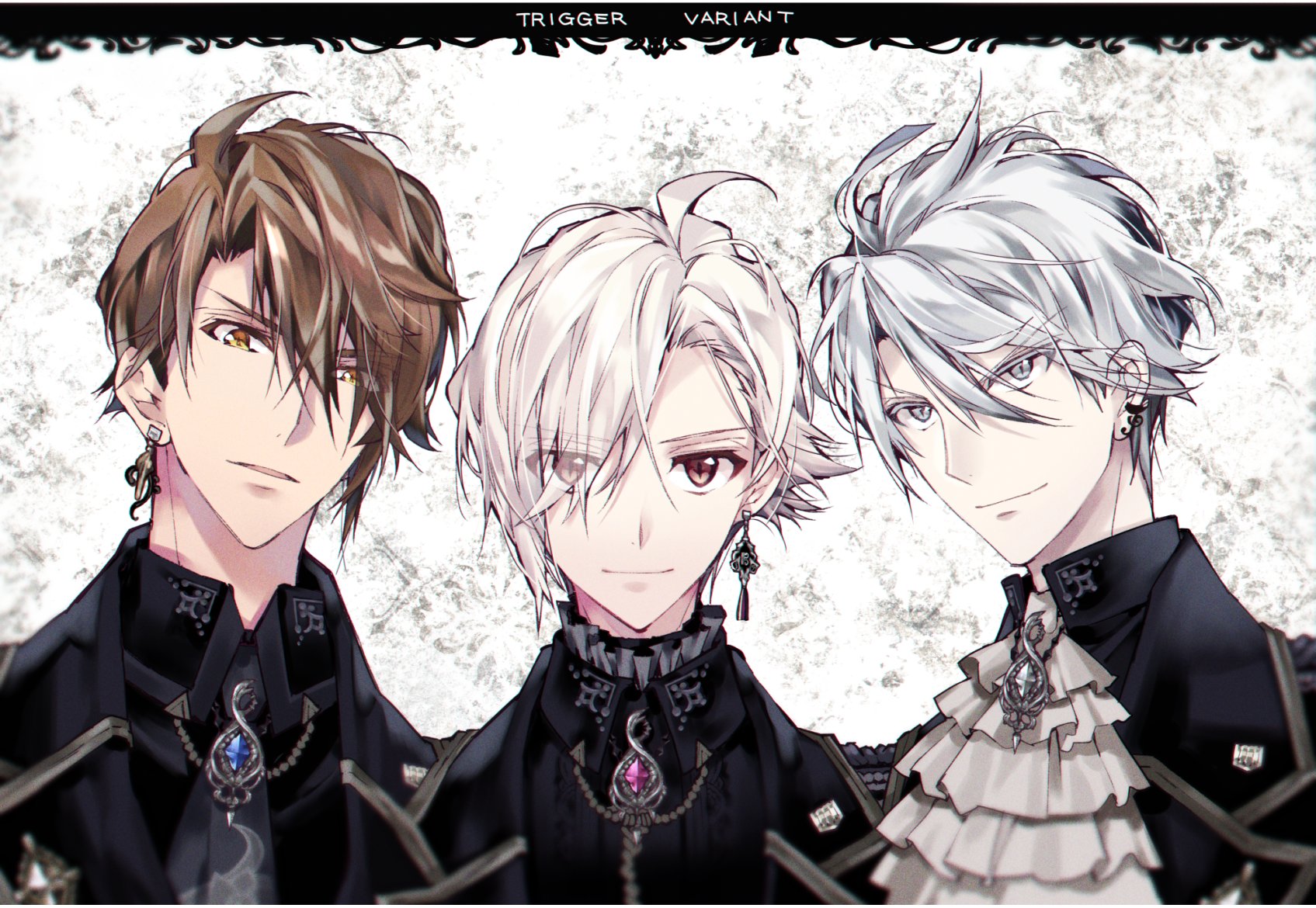 3boys ahoge anesagi_kaoru black_suit blonde_hair brown_eyes brown_hair earrings eyes_visible_through_hair formal_clothes frilled_skirt frills gem gloves grey_eyes hair_between_eyes highres jewelry kujo_tenn light_smile long_sleeves looking_at_viewer male_focus multiple_boys open_mouth pink_eyes pink_hair red_eyes red_hair shirt short_hair skirt slit_pupils smile suit tanemura_arina trigger_(idolish7) upper_body white_hair yaotome_gaku
