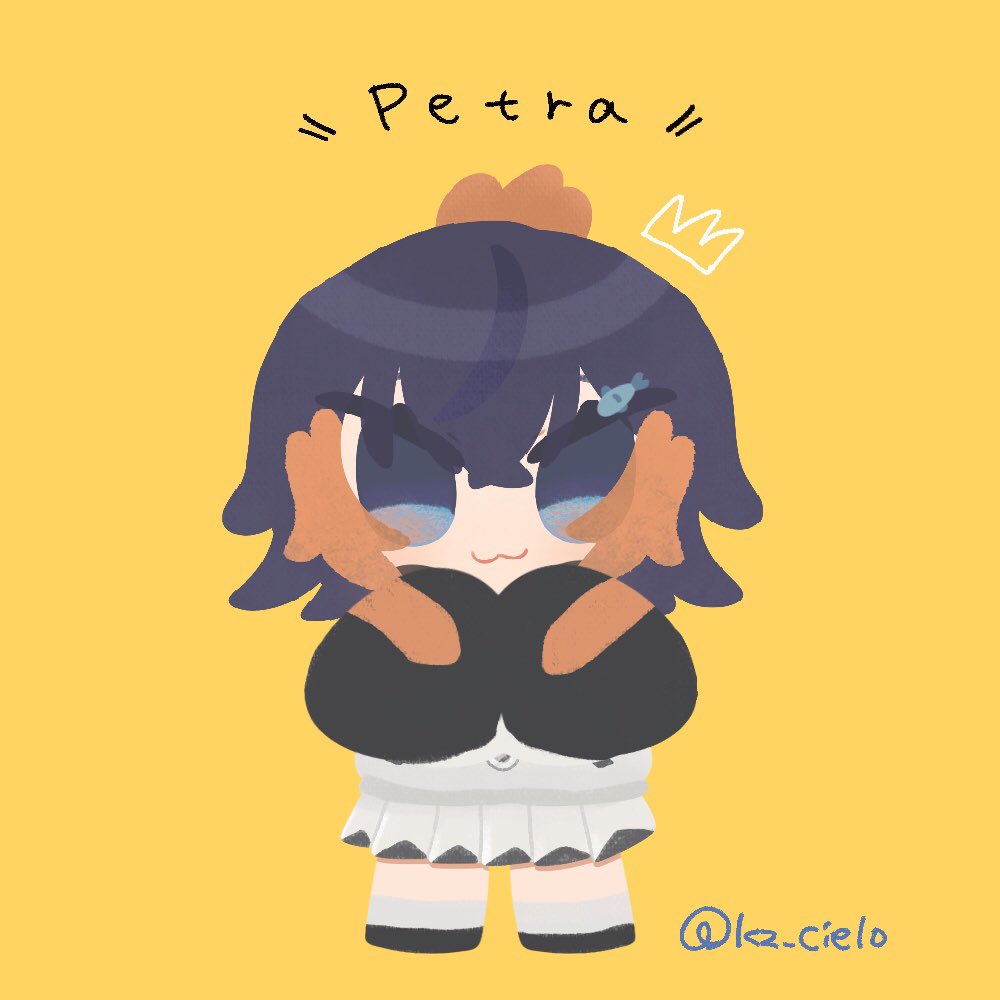1girl :3 black_hair black_shoes blue_eyes brown_hair character_name chibi full_body hood hoodie kiduta_cielo long_sleeves looking_at_viewer multicolored_hair nijisanji nijisanji_en petra_gurin petra_gurin_(1st_costume) pleated_skirt shoes simple_background skirt sleeves_past_fingers sleeves_past_wrists socks solo standing streaked_hair twitter_username virtual_youtuber white_hoodie white_skirt white_socks yellow_background