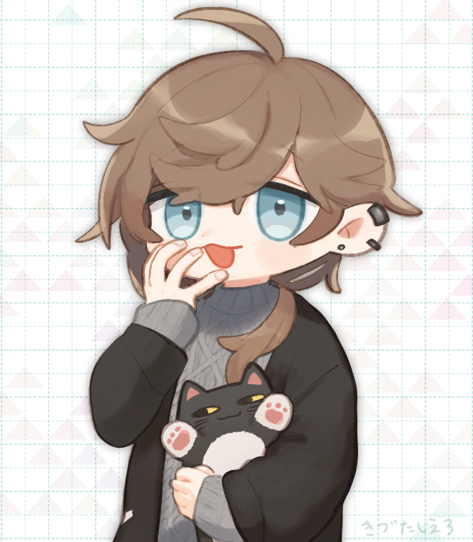 1boy :d ahoge aran_sweater black_jacket blue_eyes brown_hair cable_knit chibi ear_piercing earrings grey_sweater hair_between_eyes hand_to_own_mouth hand_up jacket jewelry kanae_(8th_costume)_(nijisanji) kanae_(nijisanji) kiduta_cielo long_sleeves male_focus nijisanji open_clothes open_jacket open_mouth piercing roto_(kanae) sleeves_past_wrists smile solo stud_earrings sweater translation_request upper_body virtual_youtuber