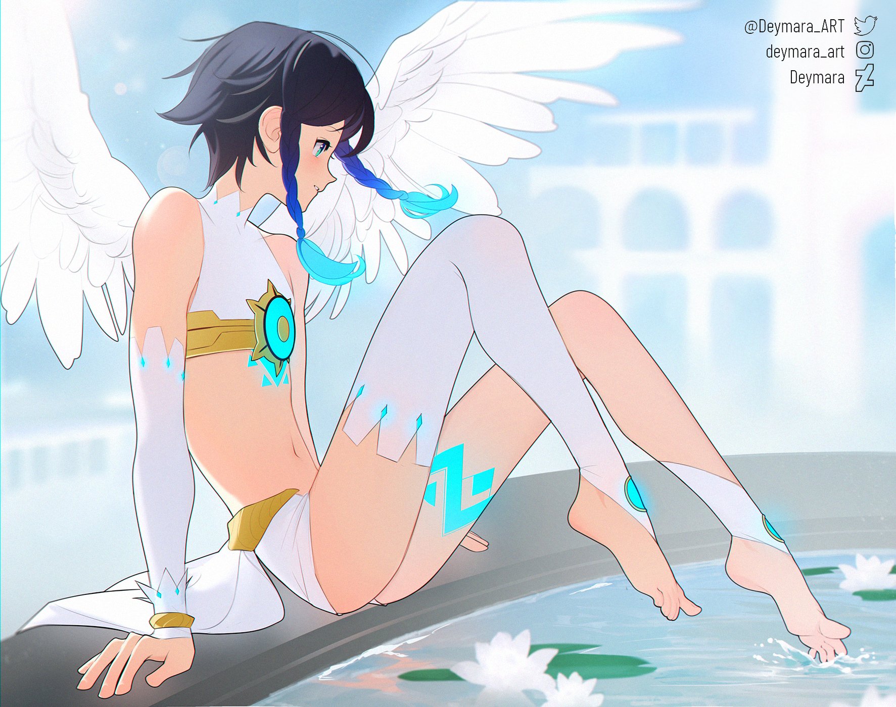 1boy androgynous barefoot black_hair blue_eyes blue_hair braid bridal_gauntlets capelet chest_tattoo commentary crop_top deymara elbow_gloves english_commentary feathered_wings genshin_impact gloves glowing glowing_hair gold_trim gradient_hair highres hood hooded_capelet leg_tattoo multicolored_hair official_alternate_costume shirt short_hair_with_long_locks shorts single_thighhigh sitting solo tattoo thighhighs toeless_legwear twin_braids twitter_logo venti_(archon)_(genshin_impact) venti_(genshin_impact) white_gloves white_shirt white_shorts white_wings wings