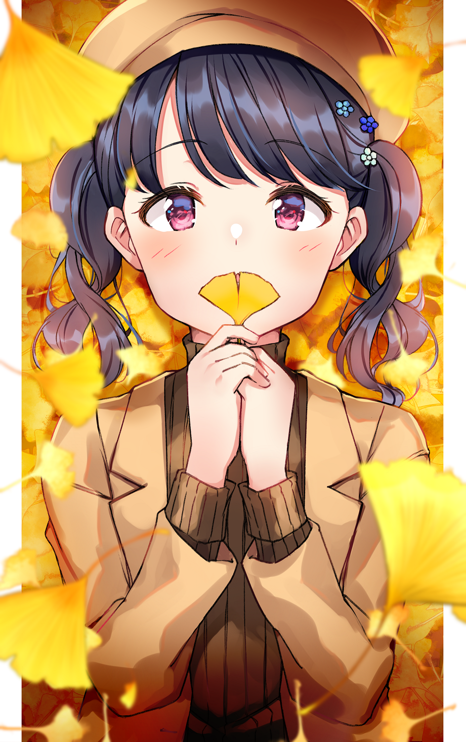 1girl autumn autumn_leaves beret black_hair commentary_request falling_leaves flower fukumaru_koito ginkgo_tree ginkgo_leaf hair_flower hair_ornament hat highres holding holding_leaf idolmaster idolmaster_shiny_colors leaf long_sleeves looking_at_viewer purple_eyes shiitake_taishi solo sweater turtleneck turtleneck_sweater twintails