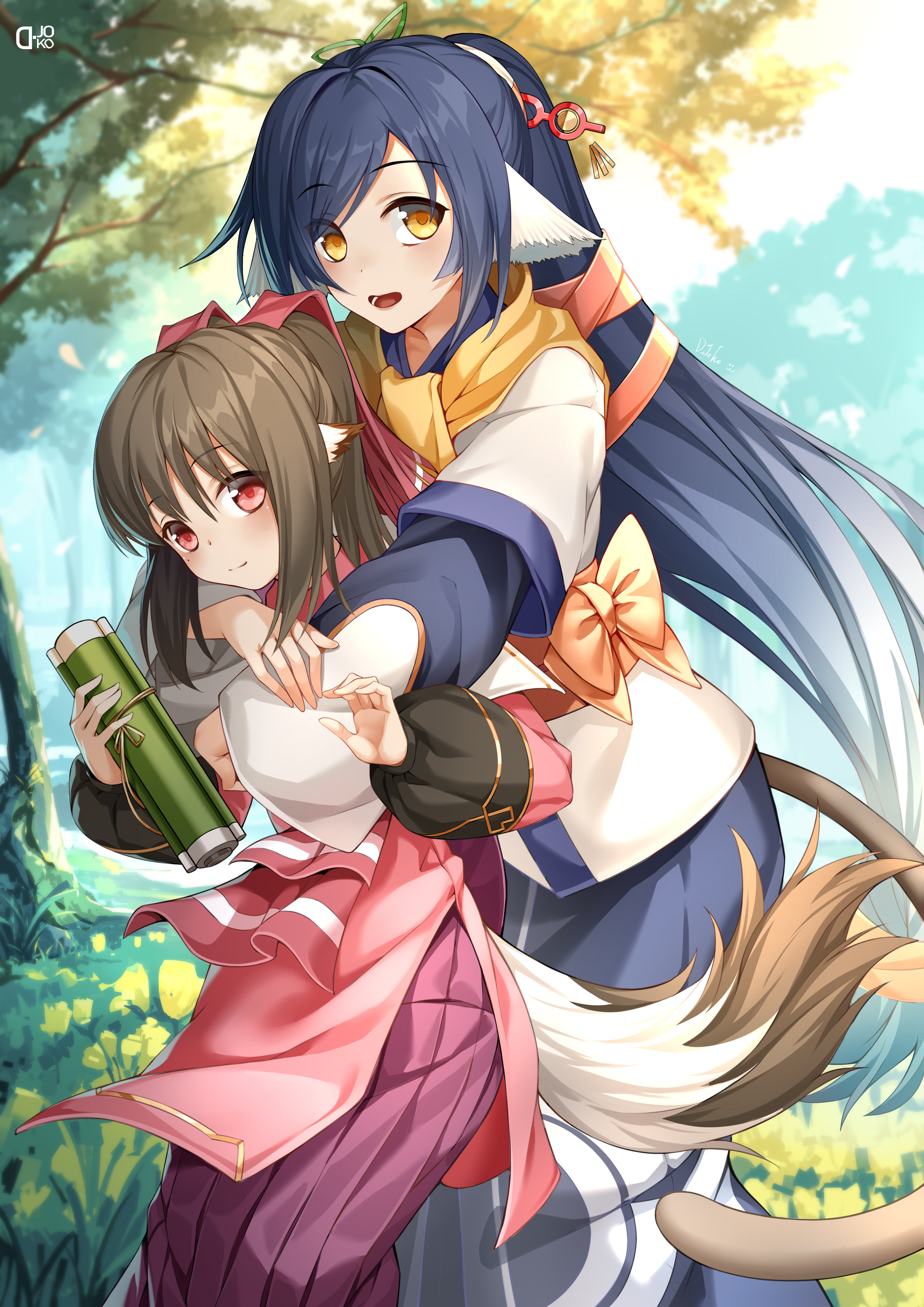 2girls absurdly_long_hair absurdres age_difference ainu_clothes animal_ears aquaplus black_hair blue_sky blush branch brown_hair cat_tail closed_mouth cloud cloudy_sky cowboy_shot d._joko dress eyes_visible_through_hair hair_between_eyes hair_ornament hair_over_one_eye hair_ribbon height_difference highres holding holding_scroll hug hug_from_behind kuon_(utawarerumono) layered_sleeves leaning_forward long_hair long_sleeves looking_at_viewer low-tied_long_hair multiple_girls nekone_(utawarerumono) open_mouth orange_eyes orange_sash outdoors ponytail raised_eyebrows red_eyes ribbon sash scarf scroll sidelocks sky smile standing swept_bangs tail teeth tongue tree twintails utawarerumono utawarerumono:_itsuwari_no_kamen very_long_hair wide_sleeves yellow_scarf