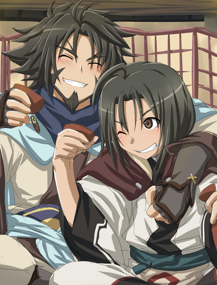 2boys ahoge ainu_clothes aquaplus arm_around_shoulder arms_up black_hair blush cape choko_(cup) clenched_teeth cup closed_eyes fingerless_gloves gauntlets gloves grin haku_(utawarerumono) height_difference long_hair long_sleeves messy_hair mole mole_under_eye multiple_boys one_eye_closed shirosame sitting smile teeth ukon_(utawarerumono) upper_body utawarerumono utawarerumono:_itsuwari_no_kamen wide_sleeves