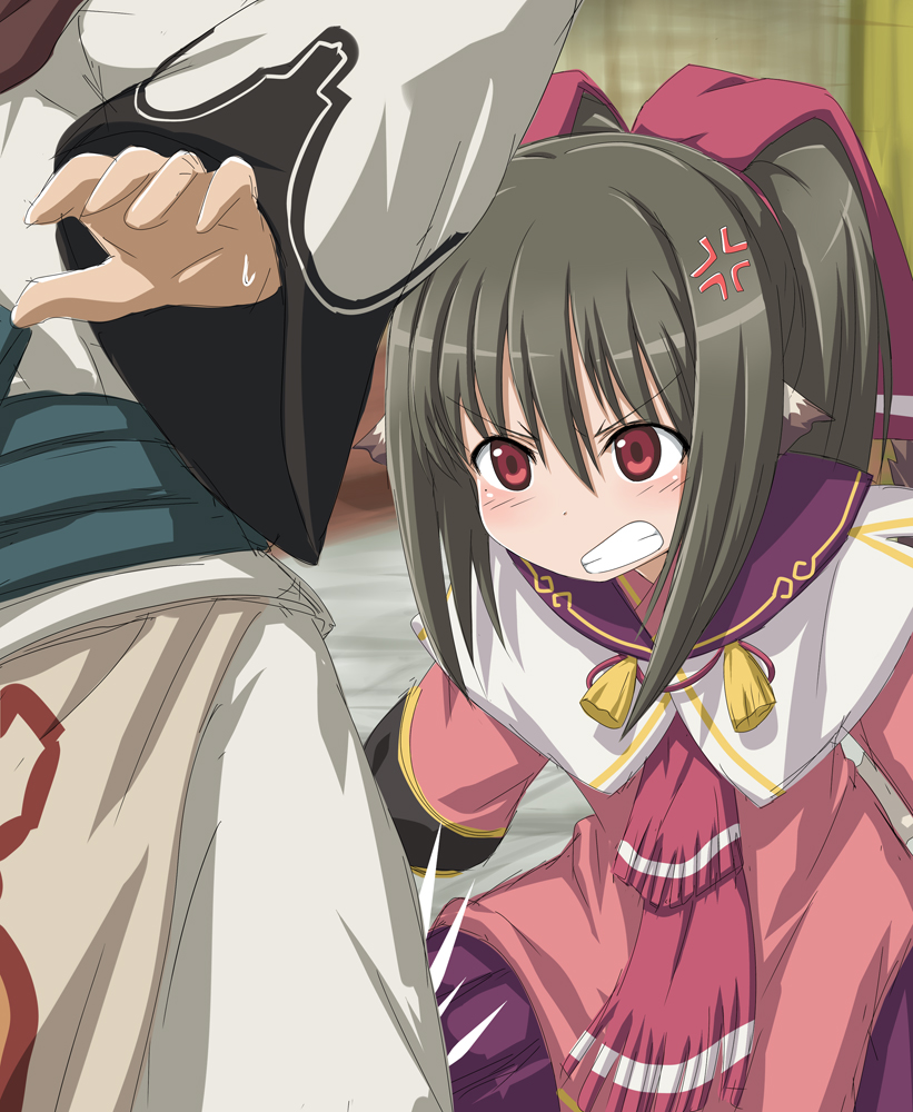 1boy 1girl age_difference ainu_clothes angry animal_ears aquaplus blush breasts brown_hair clenched_teeth dress hair_between_eyes haku_(utawarerumono) height_difference long_hair long_sleeves mole mole_under_eye nekone_(utawarerumono) raised_eyebrows red_eyes shirosame sidelocks small_breasts teeth twintails utawarerumono utawarerumono:_itsuwari_no_kamen wide_sleeves