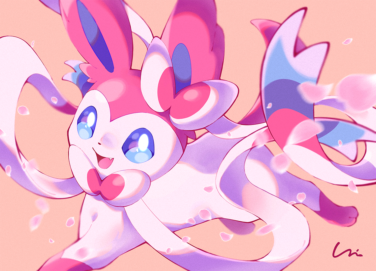 :d blue_eyes blurry bright_pupils brown_background commentary_request fang gen_6_pokemon happy nintendo no_humans open_mouth petals pokemon pokemon_(creature) signature smile solo sylveon tongue white_pupils yuni_(unitary_580)