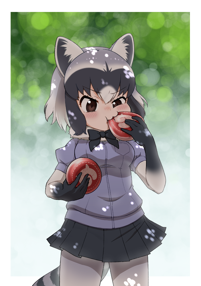 1girl animal_ears black_bow black_bowtie black_gloves black_hair black_skirt blue_sweater blush bow bowtie brown_eyes common_raccoon_(kemono_friends) eating elbow_gloves food fur_collar gloves grey_hair hoshino_mitsuki japari_bun japari_symbol kemono_friends kemono_friends_3 multicolored_hair pantyhose pleated_skirt puffy_short_sleeves puffy_sleeves raccoon_ears raccoon_girl raccoon_tail short_hair short_sleeves sidelocks skirt solo sweater tail two-tone_gloves white_fur white_gloves white_hair white_pantyhose