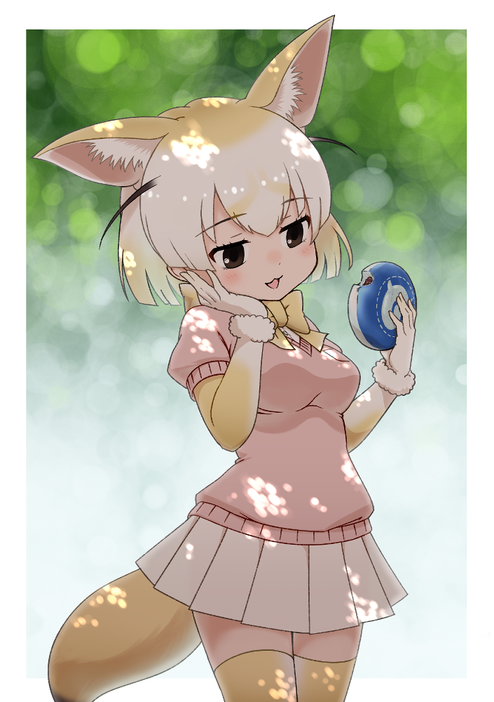 1girl :3 animal_ears blonde_hair blush bow bowtie brown_eyes cowboy_shot eating elbow_gloves extra_ears fennec_(kemono_friends) food fox_ears fox_girl fox_tail fur_trim gloves hoshino_mitsuki japari_bun japari_symbol kemono_friends kemono_friends_3 multicolored_hair open_mouth pink_sweater_vest pleated_skirt puffy_short_sleeves puffy_sleeves short_hair short_sleeves skirt solo sweater_vest tail thighhighs white_hair white_skirt yellow_bow yellow_bowtie yellow_gloves yellow_thighhighs zettai_ryouiki
