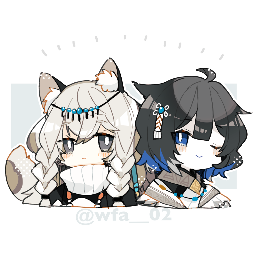 2girls ahoge animal_ear_fluff animal_ears arknights black_hair blue_eyes blue_hair blush braid chibi grey_eyes grey_hair itsuki_02 jewelry kjera_(arknights) long_hair looking_at_viewer multicolored_hair multiple_girls necklace poncho pramanix_(arknights) short_hair side_braids simple_background smile snow_leopard_ears snow_leopard_girl snow_leopard_tail streaked_hair sweater tail tiara turtleneck turtleneck_sweater upper_body white_background white_sweater