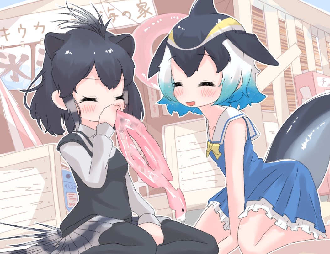 2girls black_legwear blonde_hair blowhole blue_dress blue_hair blush bow bowtie cetacean_tail closed_eyes collared_shirt common_dolphin_(kemono_friends) crested_porcupine_(kemono_friends) dolphin_girl dorsal_fin dress extra_ears fins fish_tail frilled_skirt frills grey_hair grey_skirt grey_sweater grey_vest inflatable_toy innertube kemono_friends kemono_friends_3 kneeling long_sleeves multicolored_hair multiple_girls pantyhose pleated_skirt porcupine_ears sailor_collar sarutori shirt short_hair skirt sleeveless sweater swim_ring tail vest yellow_bow yellow_bowtie
