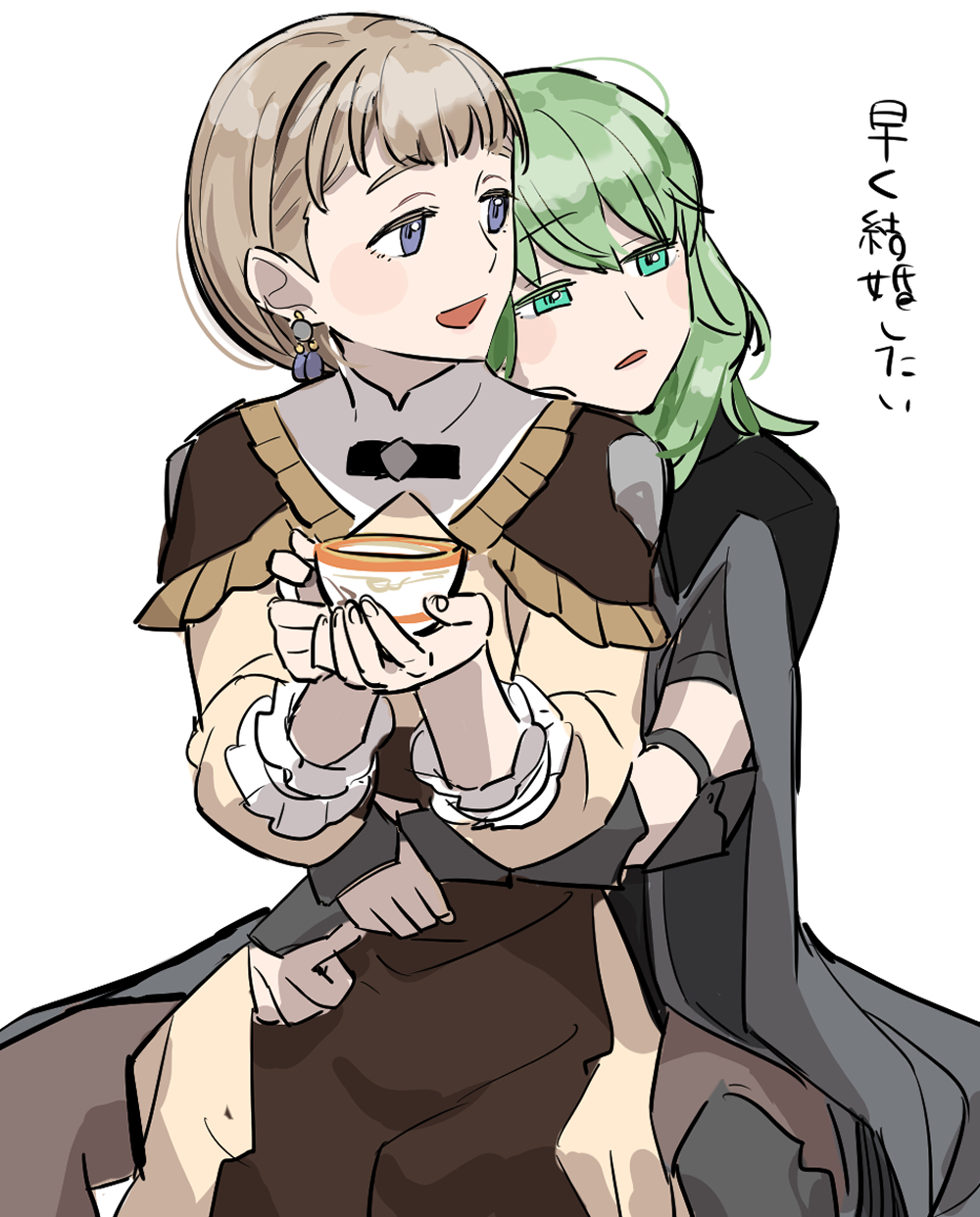 2girls blue_eyes blush blush_stickers brown_dress female_byleth_(awakened)_(fire_emblem) female_byleth_(fire_emblem) coat coat_on_shoulders commentary cowboy_shot cup dress earrings fire_emblem fire_emblem:_three_houses green_eyes green_hair grey_coat half-closed_eyes head_on_another's_shoulder highres holding holding_cup hug hug_from_behind jewelry light_brown_hair looking_afar looking_back medium_hair mercedes_von_martritz mercedes_von_martritz_(timeskip) multiple_girls nintendo open_mouth own_hands_together pantyhose parted_lips shishima_eichi short_hair simple_background sitting teacup translated vambraces white_background yuri