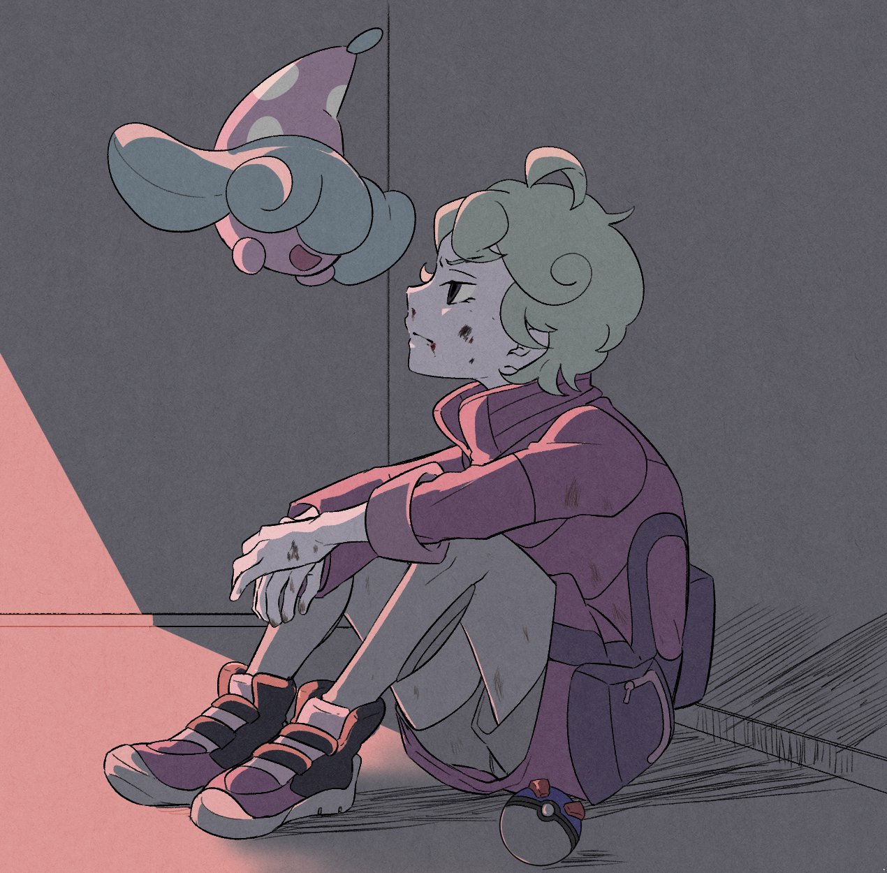 1boy ahoge bede_(pokemon) blonde_hair coat commentary_request curly_hair dirty gen_8_pokemon hatenna highres kono2noko male_focus nintendo pants pokemon pokemon_(creature) pokemon_sword_and_shield pouch purple_bag purple_coat shoes short_hair sitting sleeves_rolled_up sneakers white_pants