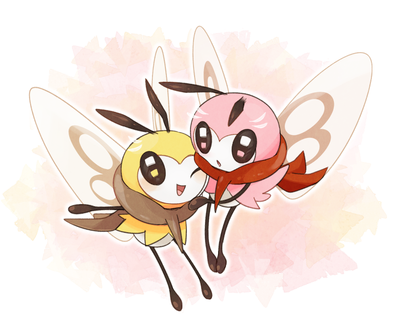:o ;d alternate_color brown_scarf commentary_request gen_7_pokemon kono2noko nintendo no_humans one_eye_closed open_mouth pokemon pokemon_(creature) red_scarf ribombee scarf shiny_and_normal shiny_pokemon smile tongue