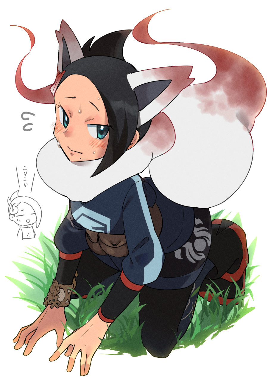 1girl animal_ears black_footwear black_hair black_pantyhose black_skirt blush boots bracelet chibi chibi_inset closed_mouth commentary_request flying_sweatdrops grass green_eyes highres hisuian_zorua illusion_(pokemon) jacket jewelry kneeling kono2noko looking_to_the_side mai_(pokemon) nintendo pantyhose pokemon pokemon_legends:_arceus pokemon_tail short_hair skirt sweat tail white_background