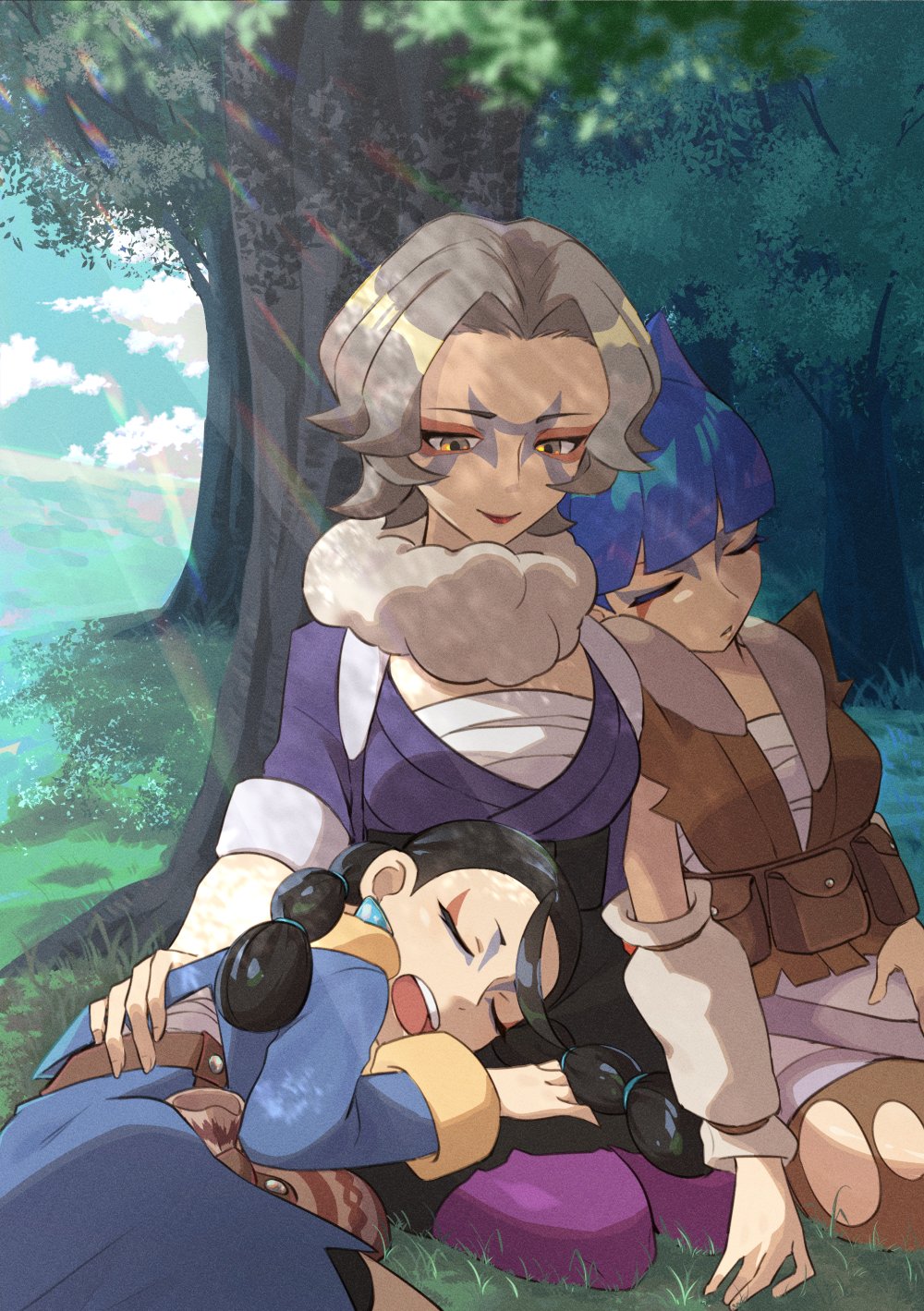 3girls black_hair blue_hair blunt_bangs brown_vest charm_(pokemon) closed_eyes closed_mouth cloud clover_(pokemon) coin_(pokemon) commentary_request day facial_mark grass grey_hair highres kono2noko lying multi-tied_hair multiple_girls nintendo open_mouth outdoors pokemon pokemon_legends:_arceus short_hair skirt sky sleeping smile teeth tongue tree upper_teeth_only vest yellow_eyes