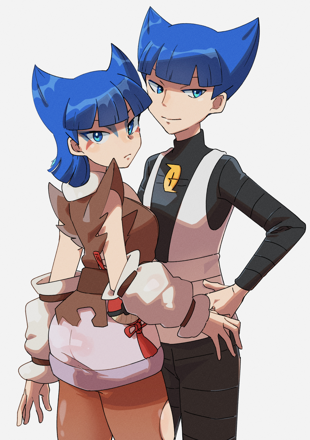 1boy 1girl black_pants black_shirt blue_eyes blue_hair blunt_bangs brown_vest closed_mouth coin_(pokemon) commentary_request cowboy_shot hand_on_own_hip highres kono2noko logo look-alike looking_at_viewer nintendo pants pantyhose pokemon pokemon_diamond/pearl/platinum pokemon_legends:_arceus saturn_(pokemon) shirt short_hair smile team_galactic team_galactic_uniform torn_clothes torn_legwear vest white_background white_vest