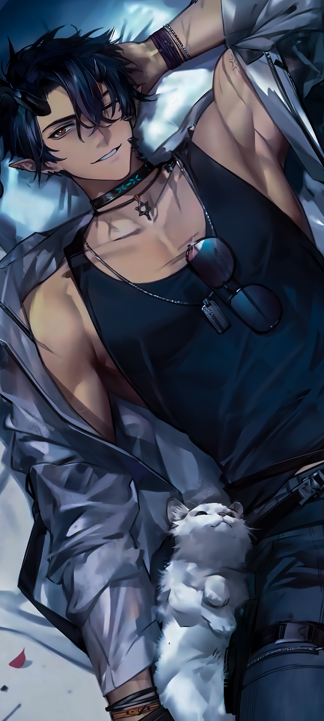 1boy absurdres arknights arm_behind_head bed bishounen black_hair black_shirt cat cowboy_shot eyewear_hang flamebringer_(arknights) flamebringer_(casual_vacation)_(arknights) from_above highres horns infection_monitor_(arknights) jacket jewelry kacyouhuugetu looking_at_viewer lying male_focus material_growth necklace one_eye_closed orange_eyes oripathy_lesion_(arknights) pointy_ears shirt smile solo sunglasses tank_top toned toned_male unworn_eyewear