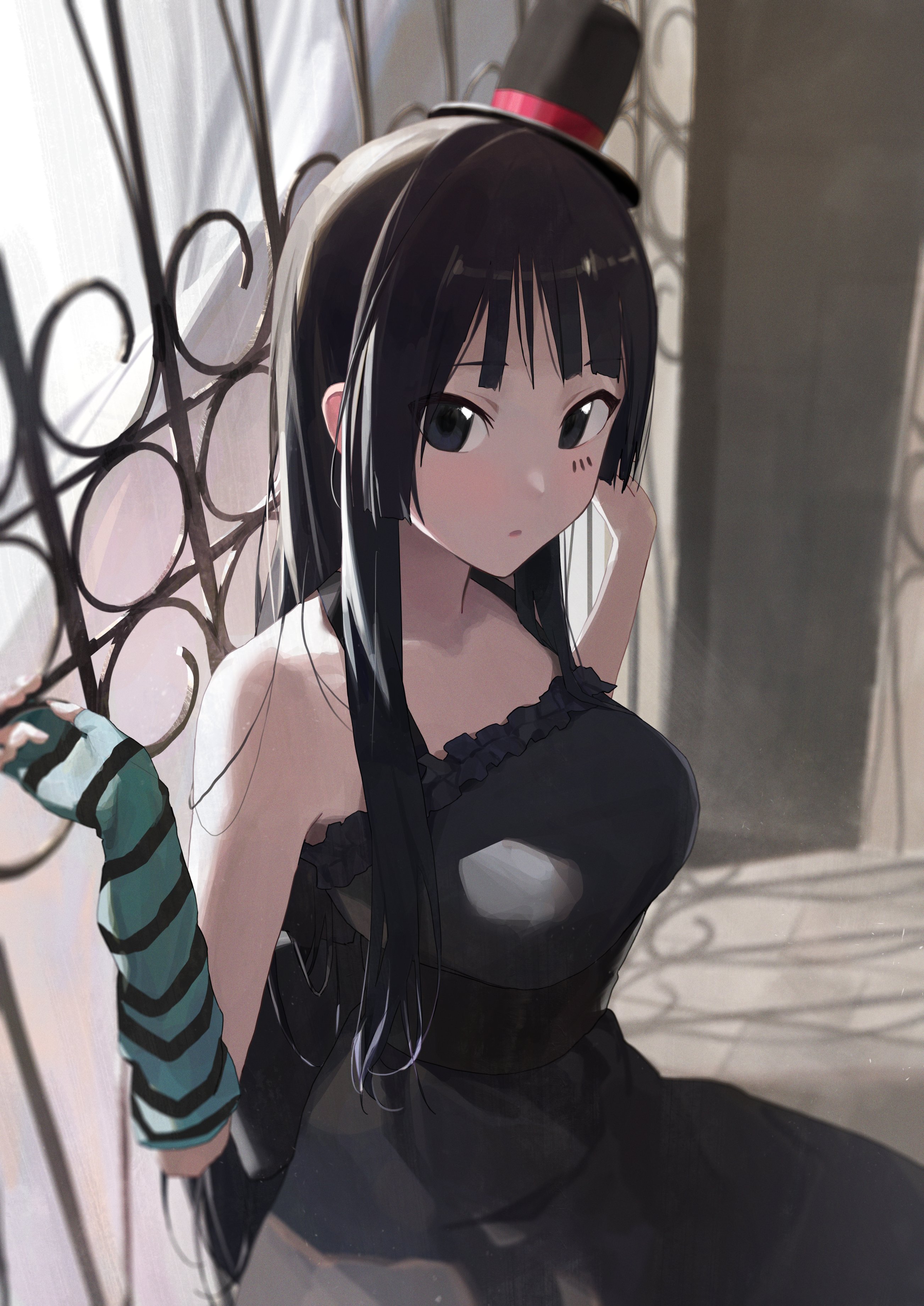 1girl absurdres akiyama_mio bare_shoulders black_dress black_eyes black_hair black_hat blunt_bangs blush breasts commentary don't_say_"lazy" dress elbow_gloves fingerless_gloves gloves hat highres hime_cut k-on! large_breasts logknn long_hair looking_at_viewer mini_hat mini_top_hat multicolored_gloves shadow sidelocks solo striped_clothes striped_gloves top_hat