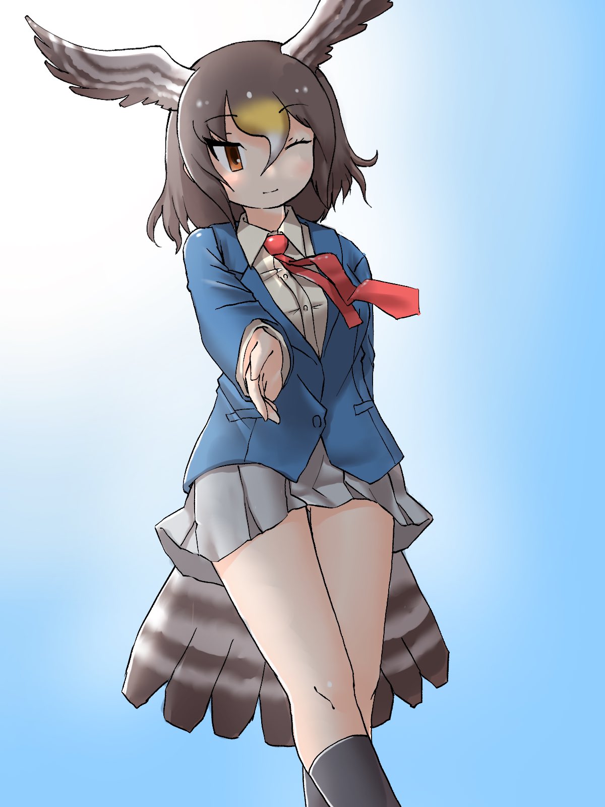 bird_girl bird_tail bird_wings black_socks blonde_hair blue_jacket blush brown_hair collared_shirt from_below grey_skirt hair_between_eyes head_wings highres jacket kemono_friends kemono_friends_3 long_sleeves looking_at_viewer multicolored_hair necktie northern_goshawk_(kemono_friends) official_alternate_costume one_eye_closed open_clothes open_jacket orange_eyes pleated_skirt red_necktie school_uniform shirt short_hair skirt socks tail uf34a white_background white_hair white_shirt wings