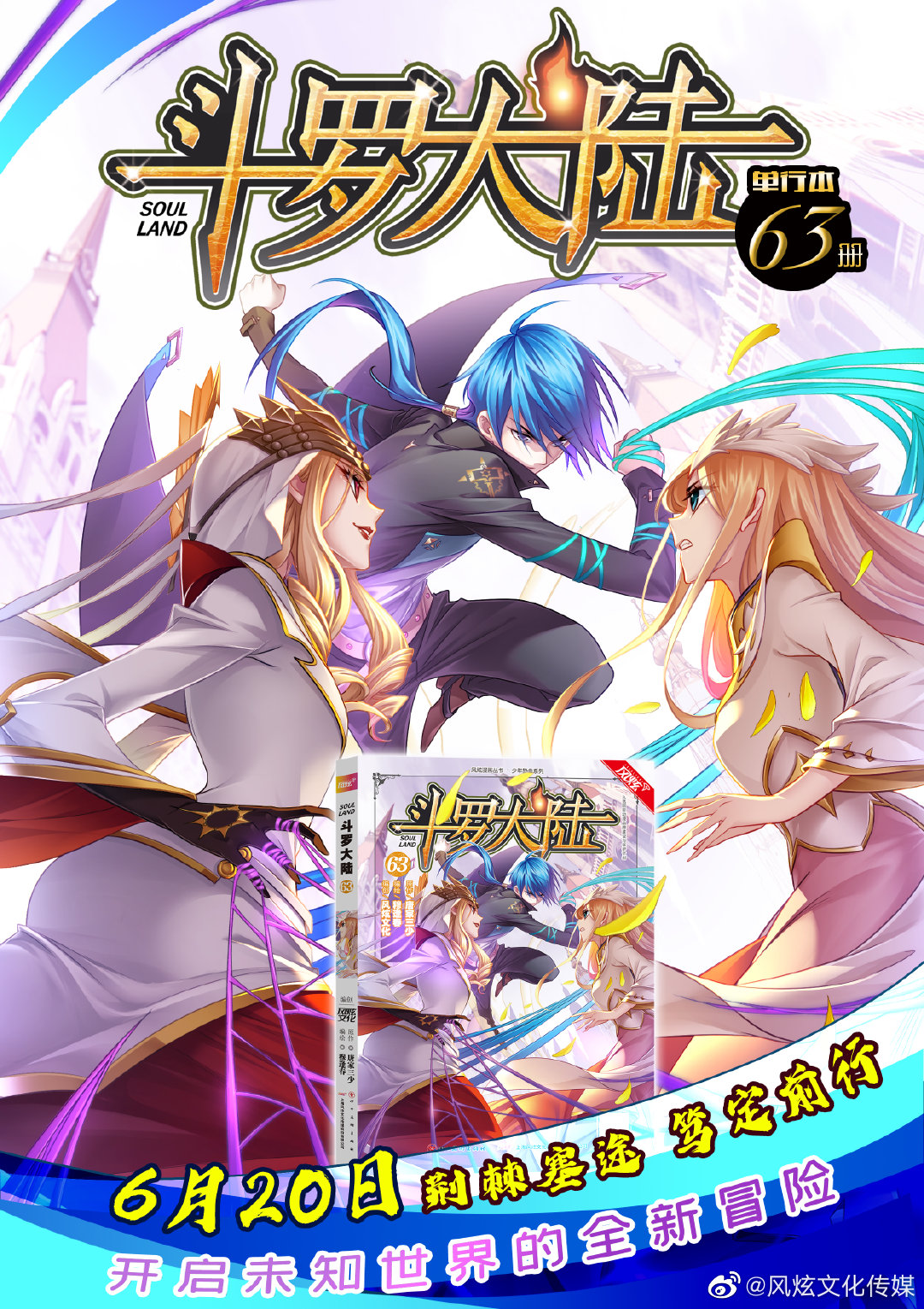 1boy 2girls bibi_dong_(douluo_dalu) blonde_hair blue_eyes blue_hair clenched_teeth cover cover_page douluo_dalu dress fighting grass hair_ornament highres hood long_hair mu_fengchun multiple_girls promotional_art official_art ponytail qian_renxue_(douluo_dalu) silk smile spider_web tang_san teeth third-party_source white_dress