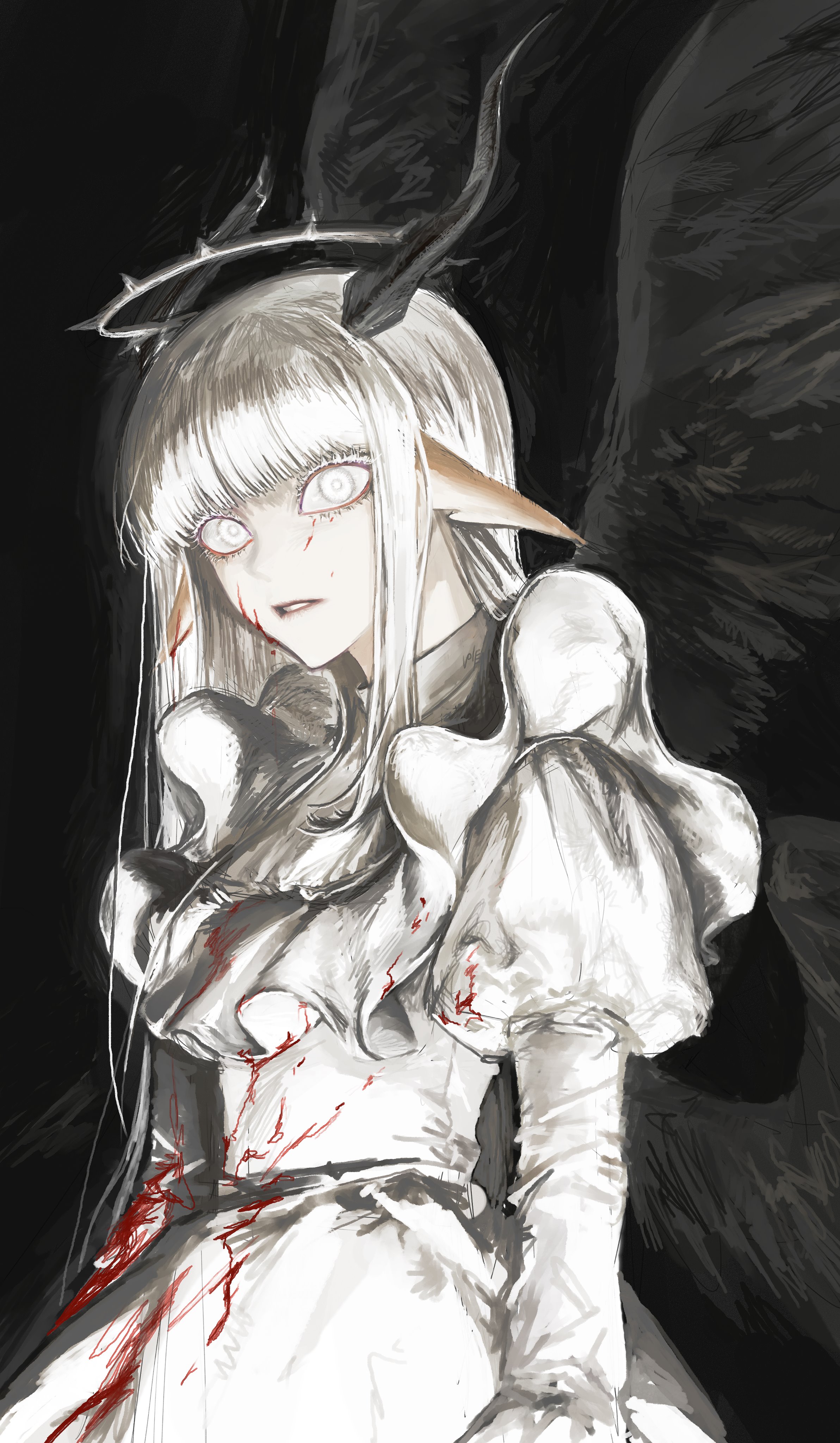 1girl absurdres arms_at_sides black_background black_wings blood blood_on_clothes blood_on_face blunt_bangs check_copyright copyright_request curled_horns dress ears_down eyelashes feathered_wings frills halo highres horns juliet_sleeves korean_commentary long_sleeves multiple_wings original parted_lips puffy_sleeves sidelocks simple_background solo spikes straight_hair upper_body volff white_dress white_eyes white_hair wings