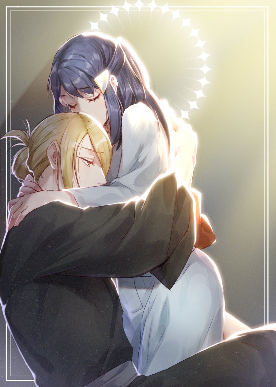 1boy 1girl akari_(pokemon) alternate_costume black_hair blonde_hair closed_eyes eyelashes framed from_side grey_sash hair_ornament hairclip half-closed_eyes highres hug japanese_clothes kimono kneeling long_hair long_sleeves nintendo ogyupoke pokemon pokemon_legends:_arceus protected_link short_hair sidelocks sitting volo_(pokemon)