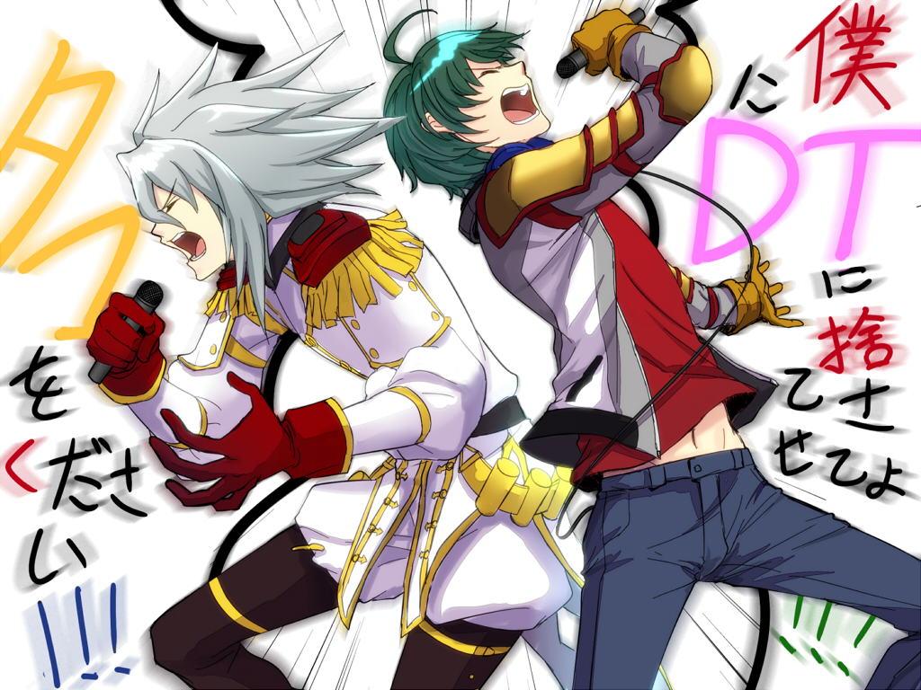 2boys erecpyle_dukakis hokaze_kon ixion_saga ixion_saga_dt microphone multiple_boys music singing