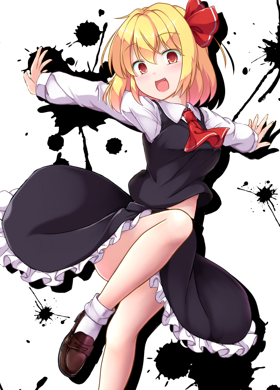 1girl aka_tawashi black_shirt black_skirt blonde_hair breasts dress fang frilled_dress frills highres long_sleeves necktie open_mouth red_eyes rumia shirt short_hair skirt t-pose touhou
