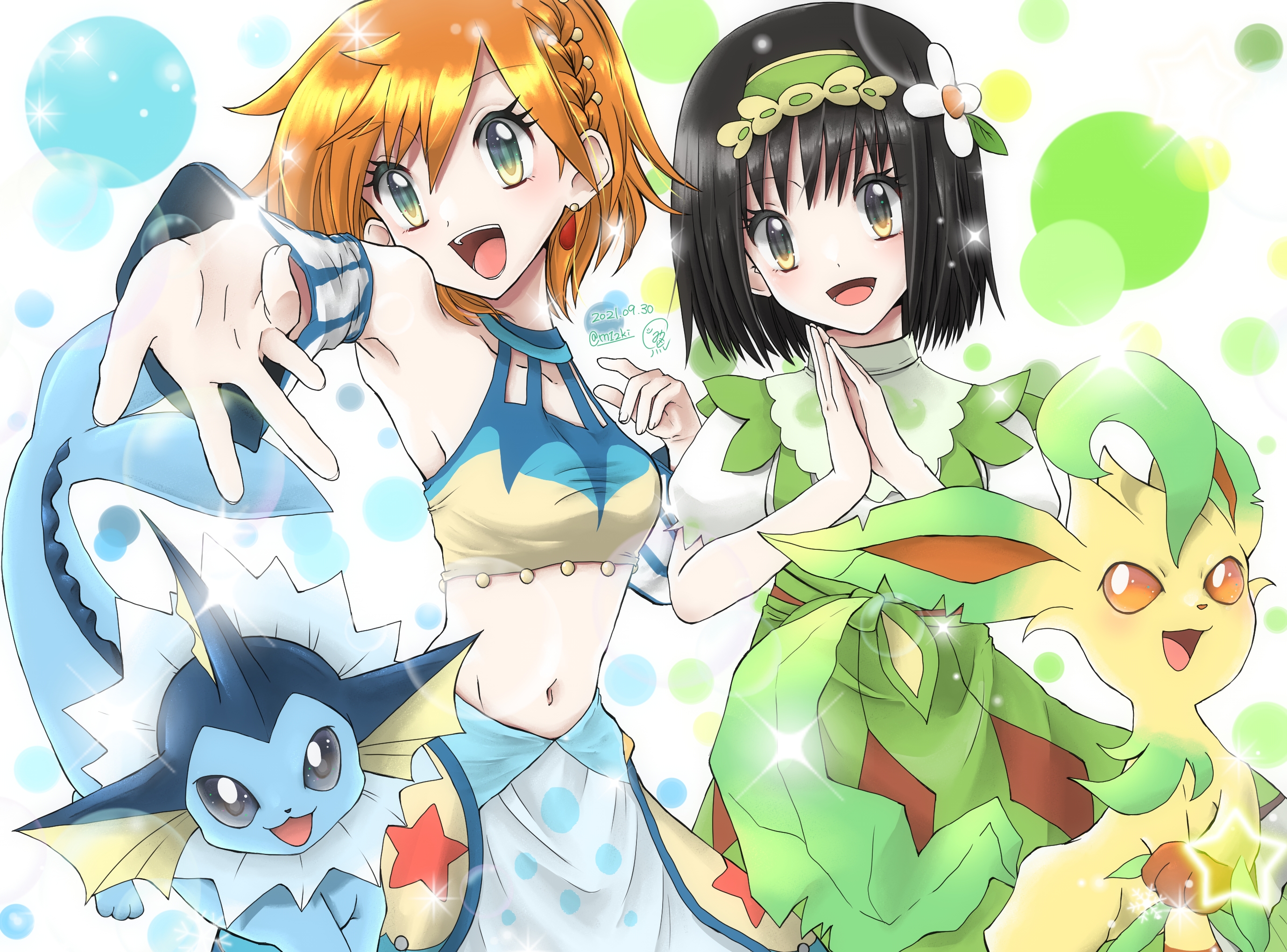 2girls armpits bare_shoulders black_eyes black_hair detached_sleeves earrings erika_(pokemon) erika_(sygna_suit)_(pokemon) eyelashes flower gen_1_pokemon gen_4_pokemon green_eyes hair_flower hair_ornament highres jewelry leafeon looking_at_viewer m12ki misty_(pokemon) misty_(sygna_suit)_(pokemon) multiple_girls navel nintendo official_alternate_costume open_mouth orange_hair pokemon pokemon_(creature) pokemon_masters_ex shirt short_hair skirt vaporeon