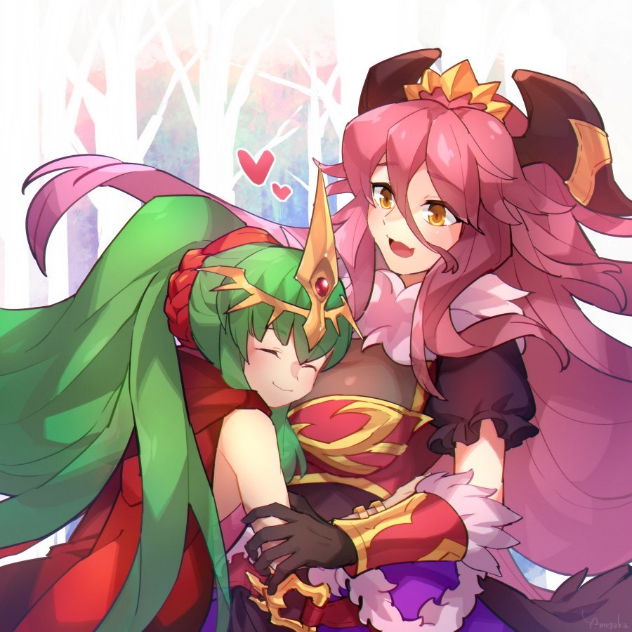 2girls closed_eyes dragalia_lost dragon_horns fang fire_emblem fire_emblem:_mystery_of_the_emblem fire_emblem_heroes gloves green_hair hair_between_eyes hair_ornament heart horns hug long_hair multiple_girls mym_(dragalia_lost) nintendo ponytail puffy_short_sleeves puffy_sleeves red_hair short_sleeves skin_fang tiki_(fire_emblem) tiki_(young)_(fire_emblem) tiki_(young)_(legendary_dragon)_(fire_emblem) upper_body very_long_hair y_m_erhu yellow_eyes