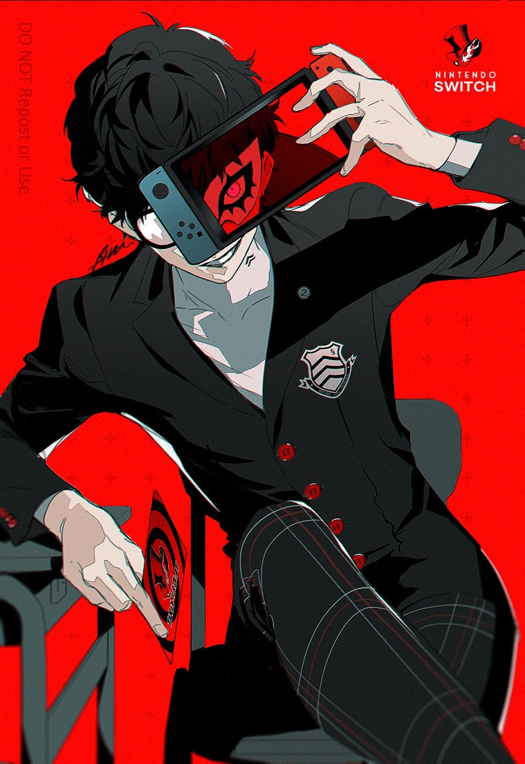 1boy amamiya_ren black_hair black_jacket btmr_game buttons calling_card chair commentary_request crossed_legs desk glasses grin handheld_game_console holding jacket joker_(persona_5) long_sleeves looking_at_viewer male_focus mask nintendo_switch opaque_glasses pants persona persona_5 plaid_clothes plaid_pants red_background school_desk school_uniform shuujin_academy_school_uniform signature simple_background sitting smile solo