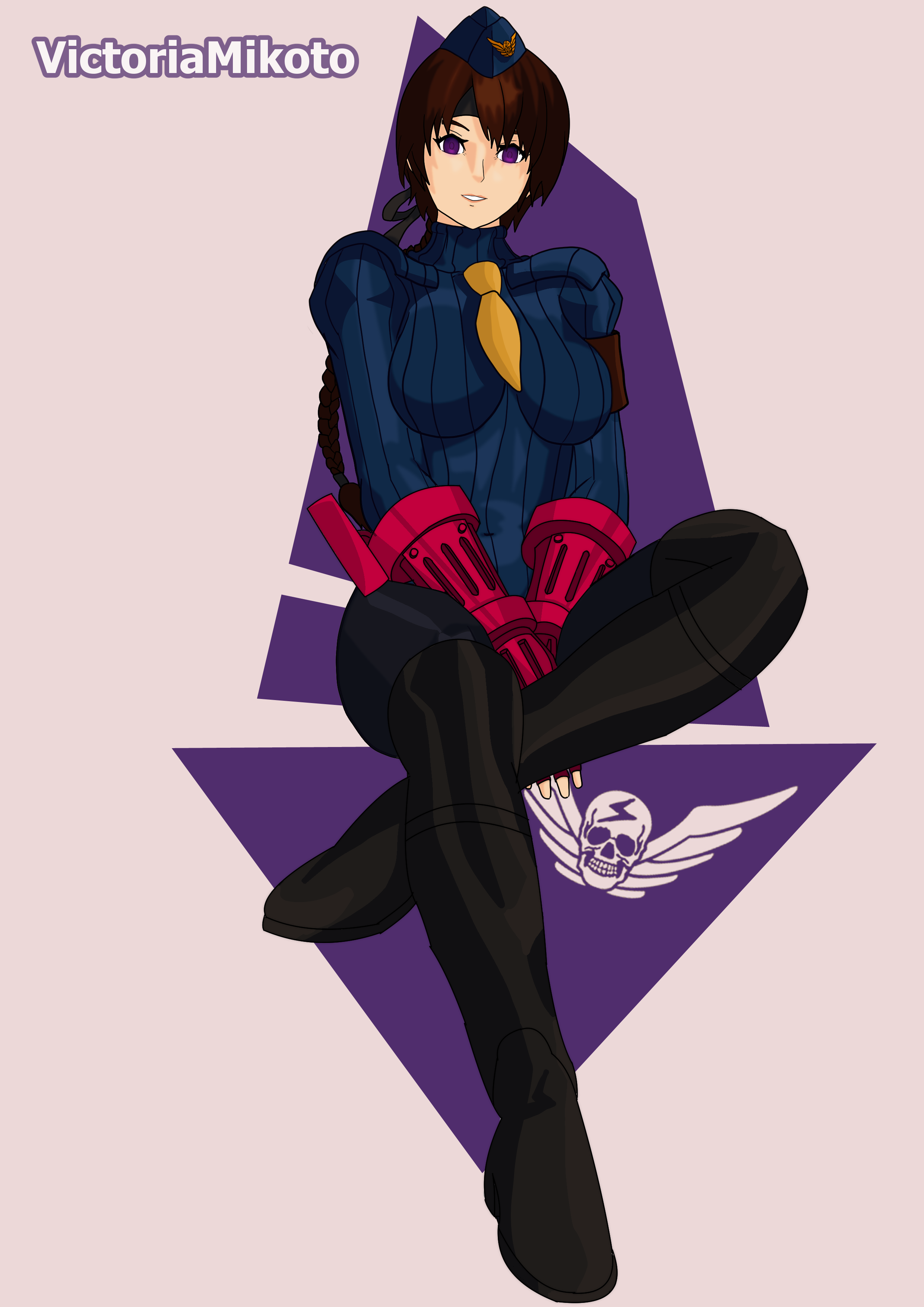 1girl absurdres bad_end bodysuit boots brown_hair capcom corruption crossover empty_eyes gauntlets headband highres leggings leotard looking_at_viewer mind_control ponytail purple_eyes ryuuko_no_ken self-upload shadaloo_dolls simple_background sitting smile snk street_fighter the_king_of_fighters victoria_mikoto yuri_sakazaki