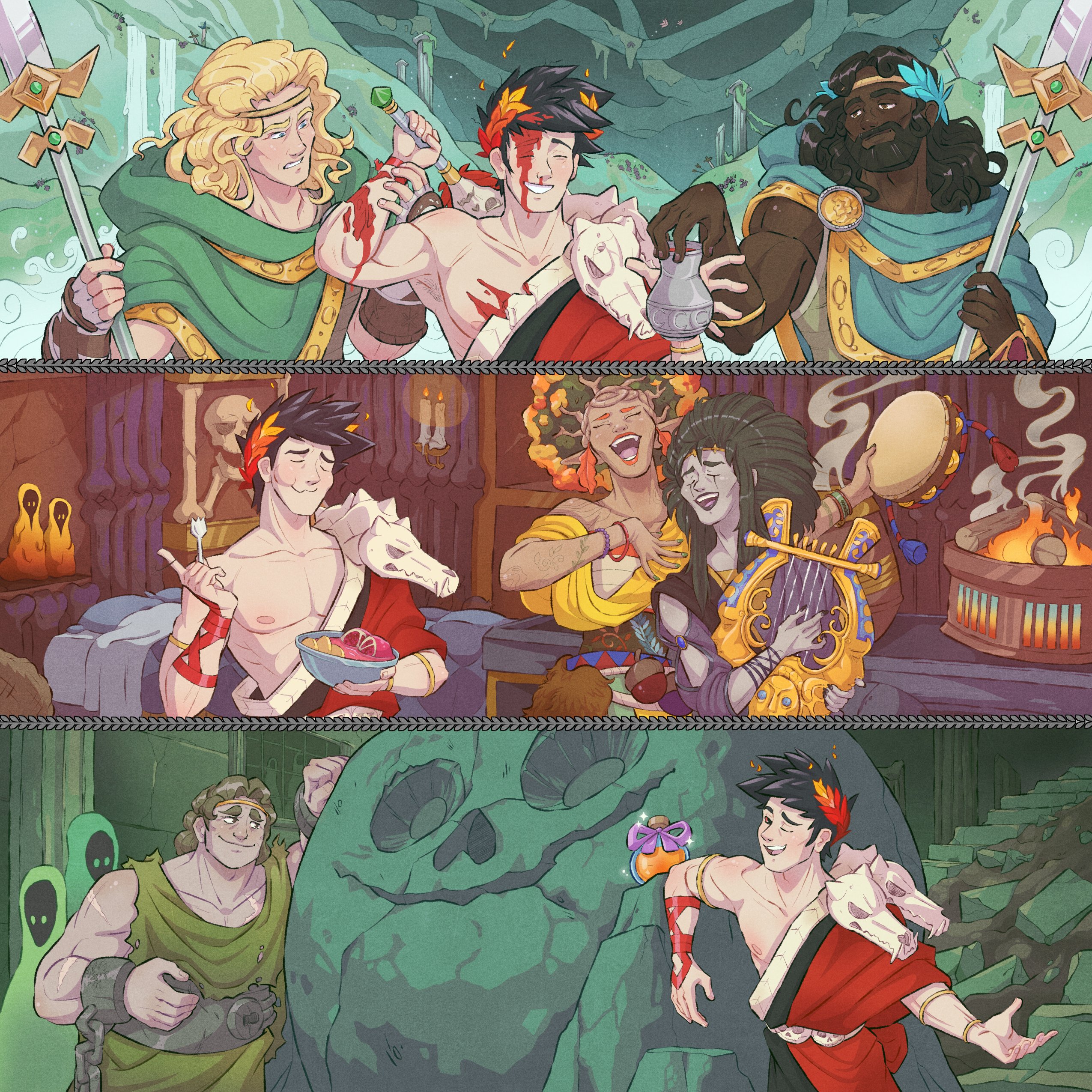 1girl 5boys absurdres achilles_(hades) ancient_greek_clothes beard black_hair black_sclera blonde_hair blood blood_on_face blue_eyes boulder bouldy bowl brown_eyes brown_hair candle circlet closed_eyes colored_sclera cuffs dark-skinned_male dark_skin eurydice_(hades) facial_hair fire food fork fruit greco-roman_clothes hades_(series) hades_1 highres instrument jamie_loughran laurel_crown lyre multiple_boys open_mouth orpheus_(hades) patroclus_(hades) pointy_ears polearm pomegranate red_eyes shackles single_bare_shoulder sisyphus_(hades) skull smile spear stairs sword tambourine weapon zagreus_(hades)