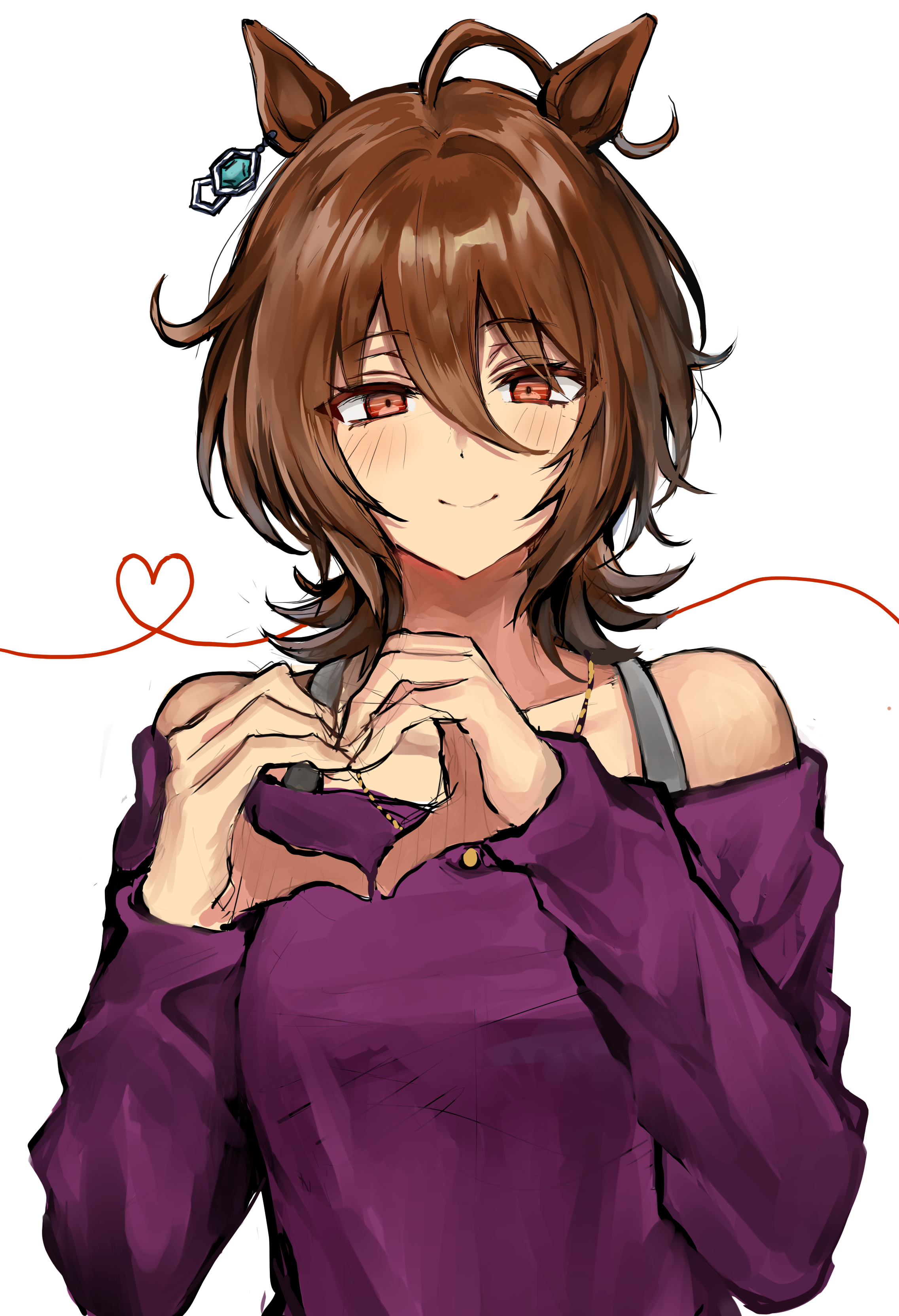 1girl absurdres agnes_tachyon_(casual)_(umamusume) agnes_tachyon_(umamusume) ahoge animal_ears bare_shoulders blush breasts brown_hair closed_mouth earrings hair_between_eyes heart heart_hands heart_of_string highres horse_ears jewelry long_sleeves looking_at_viewer medium_hair necklace off-shoulder_shirt off_shoulder orange_eyes purple_shirt shirt simple_background single_earring small_breasts smile solo umamusume upper_body white_background yongtae