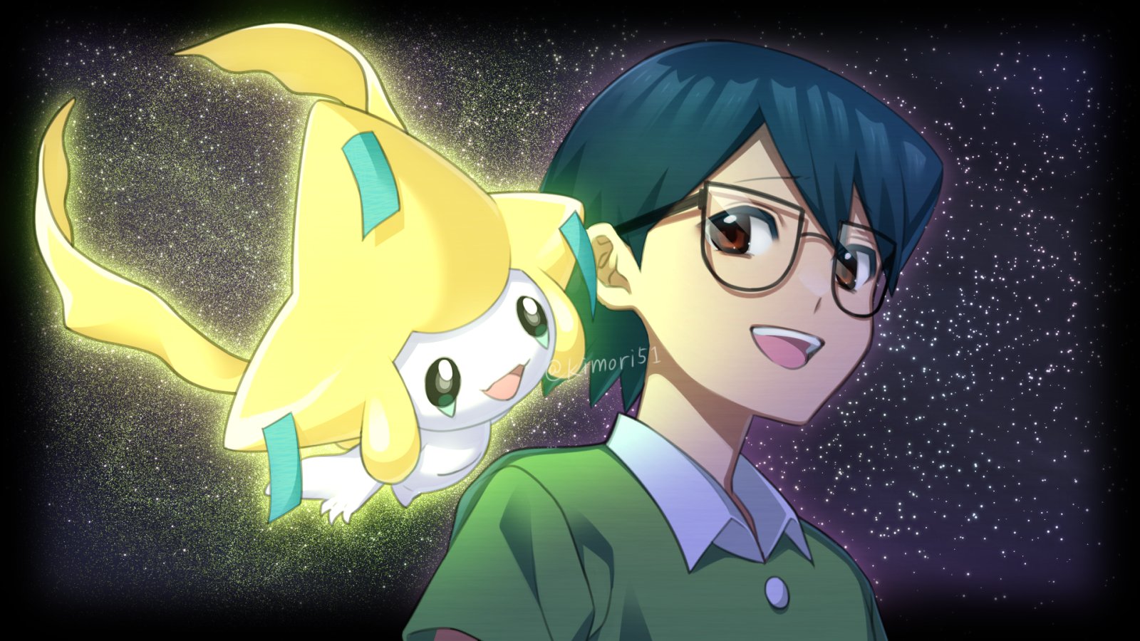1boy :d black-framed_eyewear black_border border brown_eyes commentary_request gen_3_pokemon glasses green_shirt highres jirachi legendary_pokemon male_focus max_(pokemon) mythical_pokemon nagiru night nintendo open_mouth outdoors pokemon pokemon:_jirachi:_wish_maker pokemon_(anime) pokemon_(creature) pokemon_the_series:_ruby_and_sapphire shirt short_hair short_sleeves smile star_(sky) teeth tongue upper_body upper_teeth_only