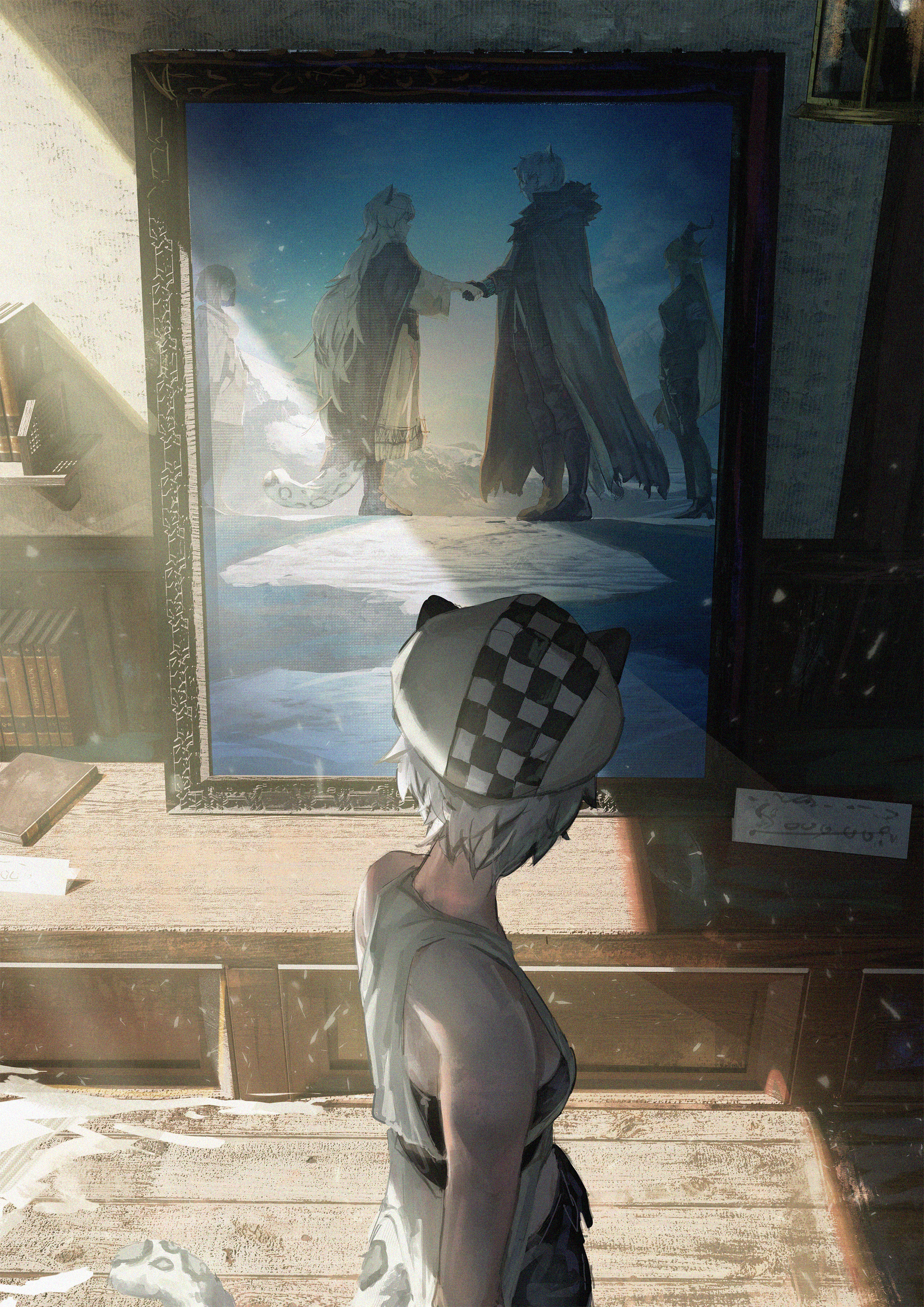 1girl absurdres animal_ears arknights arms_behind_back bare_shoulders black_hair blonde_hair boots cliffheart_(arknights) cloak degenbrecher_(arknights) dress facing_away from_side fur_collar gloves grey_hair gyoukan_(jfxc) handshake hat highres horns infection_monitor_(arknights) kjera_(arknights) long_hair looking_to_the_side painting_(object) pramanix_(arknights) shade short_hair silverash_(arknights) sleeveless snow_leopard_ears snow_leopard_tail solo standing strapless tail tube_top white_hat