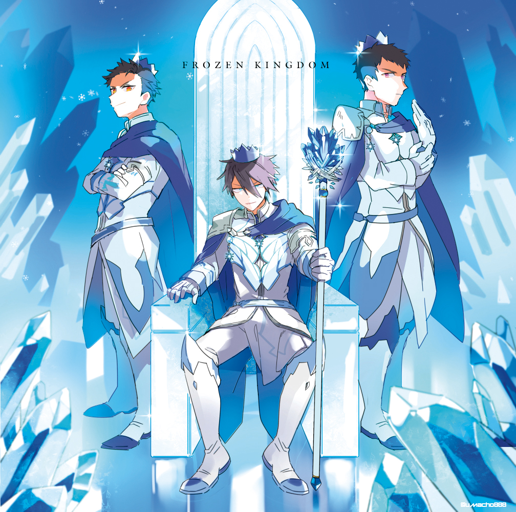 3boys adjusting_clothes adjusting_gloves akuno_hideo alternate_costume armor belt black_hair blue_eyes boots brown_hair cape crossed_arms crown frame_(idolmaster) gloves ice idol idolmaster idolmaster_side-m jacket kimura_ryu knee_boots looking_at_viewer male_focus multiple_boys on_throne purple_eyes red_eyes ryouma_(888) shingen_seiji shirt short_hair shoulder_armor smile staff throne white_gloves