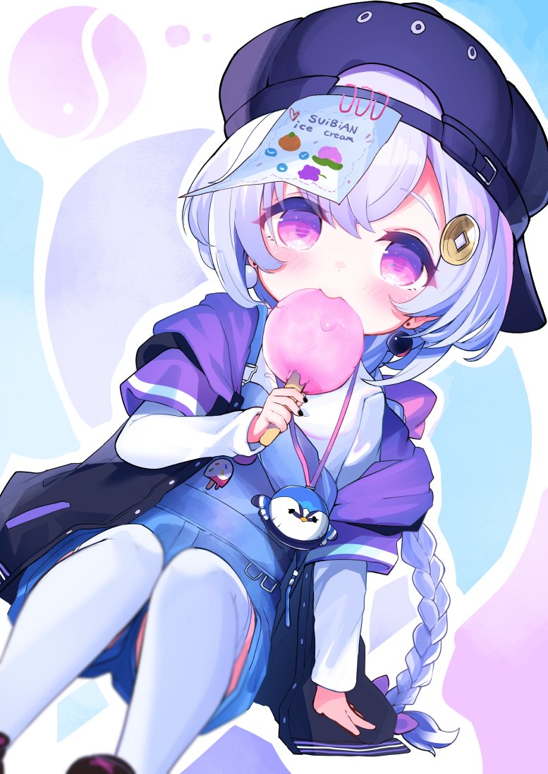 1girl baseball_cap braid casual coin_hair_ornament commentary dress eating english_text food genshin_impact hair_between_eyes hair_ornament hair_ribbon hat holding holding_stick hood hooded_jacket jacket jiangshi jojifuku knees_together_feet_apart long_hair long_sleeves looking_at_viewer low-tied_long_hair low_ponytail official_alternate_costume ofuda pinafore_dress ponytail popsicle purple_eyes purple_hair qiqi_(genshin_impact) qiqi_(suibian)_(genshin_impact) ribbon sidelocks simple_background single_braid sitting sleeveless sleeveless_dress solo stick untranslatable_commentary two-tone_background white_legwear yinpa_(wanone500511)