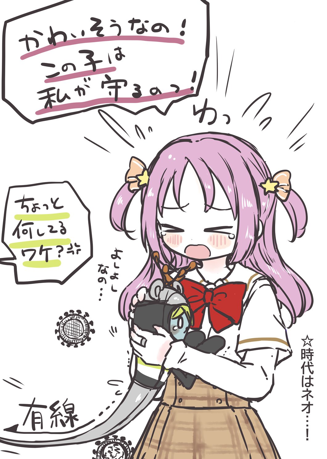 >_< 1girl animal_ears bear_ears blush bow bowtie brown_skirt buttons closed_eyes colored_skin cowboy_shot crying doppel_(madoka_magica) hair_ornament highres hug jewelry layered_sleeves long_sleeves magia_record:_mahou_shoujo_madoka_magica_gaiden mahou_shoujo_madoka_magica medium_hair misono_karin old_dorothy open_mouth parted_bangs plaid_clothes plaid_skirt pleated_skirt purple_hair red_bow red_bowtie rin_tarou ring sakae_general_school_uniform school_uniform shirt short_over_long_sleeves short_sleeves sidelocks simple_background skirt solo speech_bubble star_(symbol) star_hair_ornament two_side_up white_background white_shirt white_skin wing_collar