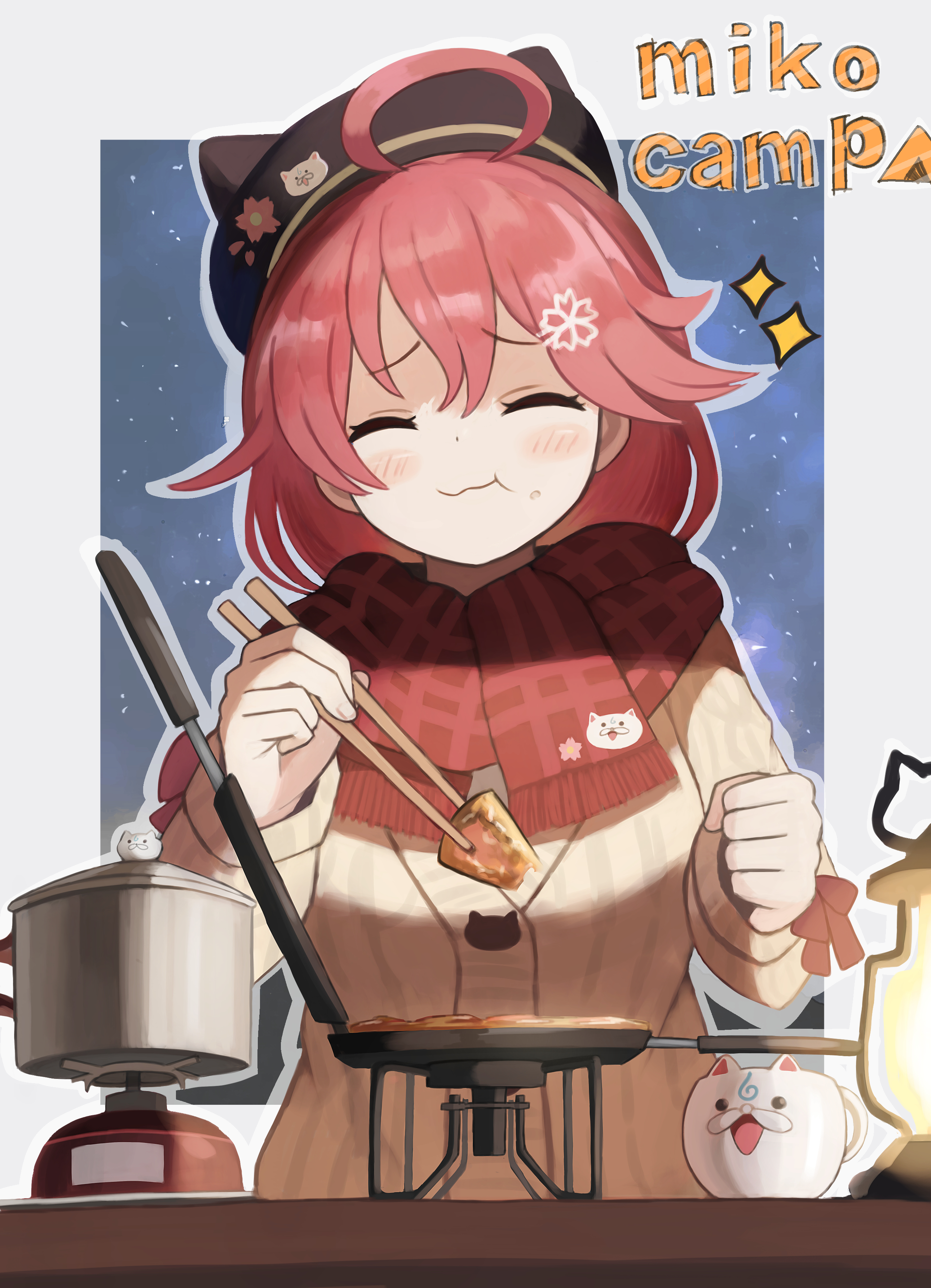 1girl 35p_(sakura_miko) absurdres ahoge animal_ear_headwear animal_ears animal_hat black_hat blush border buttons checkered_clothes checkered_scarf chopsticks closed_eyes closed_mouth cup eating fake_animal_ears flower food food_on_face fringe_trim hair_between_eyes hair_flaps hair_flower hair_ornament hairclip hat highres holding holding_chopsticks hololive kaigaraori long_sleeves medium_hair mug night oil_lamp pink_hair red_scarf ribbed_sweater sakura_miko sakura_miko_(casual) scarf sky smile solo sparkle star_(sky) starry_sky sweater table upper_body virtual_youtuber white_border yellow_sweater