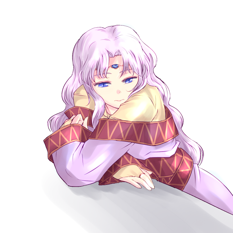 1girl blue_eyes bridal_gauntlets circlet crossed_arms dress fermelle fire_emblem fire_emblem:_thracia_776 light_purple_hair long_hair long_sleeves looking_away looking_to_the_side nintendo purple_dress reclining sara_(fire_emblem) simple_background solo upper_body white_background