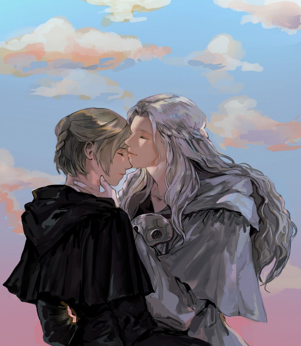 2girls black_capelet black_robe blue_sky braid brown_hair capelet closed_eyes cloud collarbone commentary_request derre facing_another final_fantasy final_fantasy_xiv from_side grey_capelet grey_hair grey_robe half_up_braid half_updo hand_on_another's_neck hood hood_down hooded_capelet kiss kissing_forehead korean_commentary long_hair mask multiple_girls outdoors profile robe short_hair single_braid sky smile unworn_mask upper_body venat_(ff14) warrior_of_light_(ff14) wavy_hair