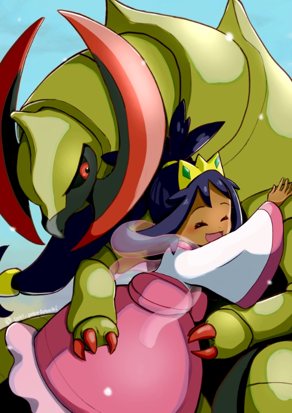 1girl artist_request dark-skinned_female dark_skin dragon dress gen_5_pokemon girl_and_dragon grabbing_from_behind happy haxorus horns hug iris_(pokemon) looking_at_another nintendo open_mouth pokemon pokemon_(creature) pokemon_black_2_and_white_2 purple_hair smile tiara