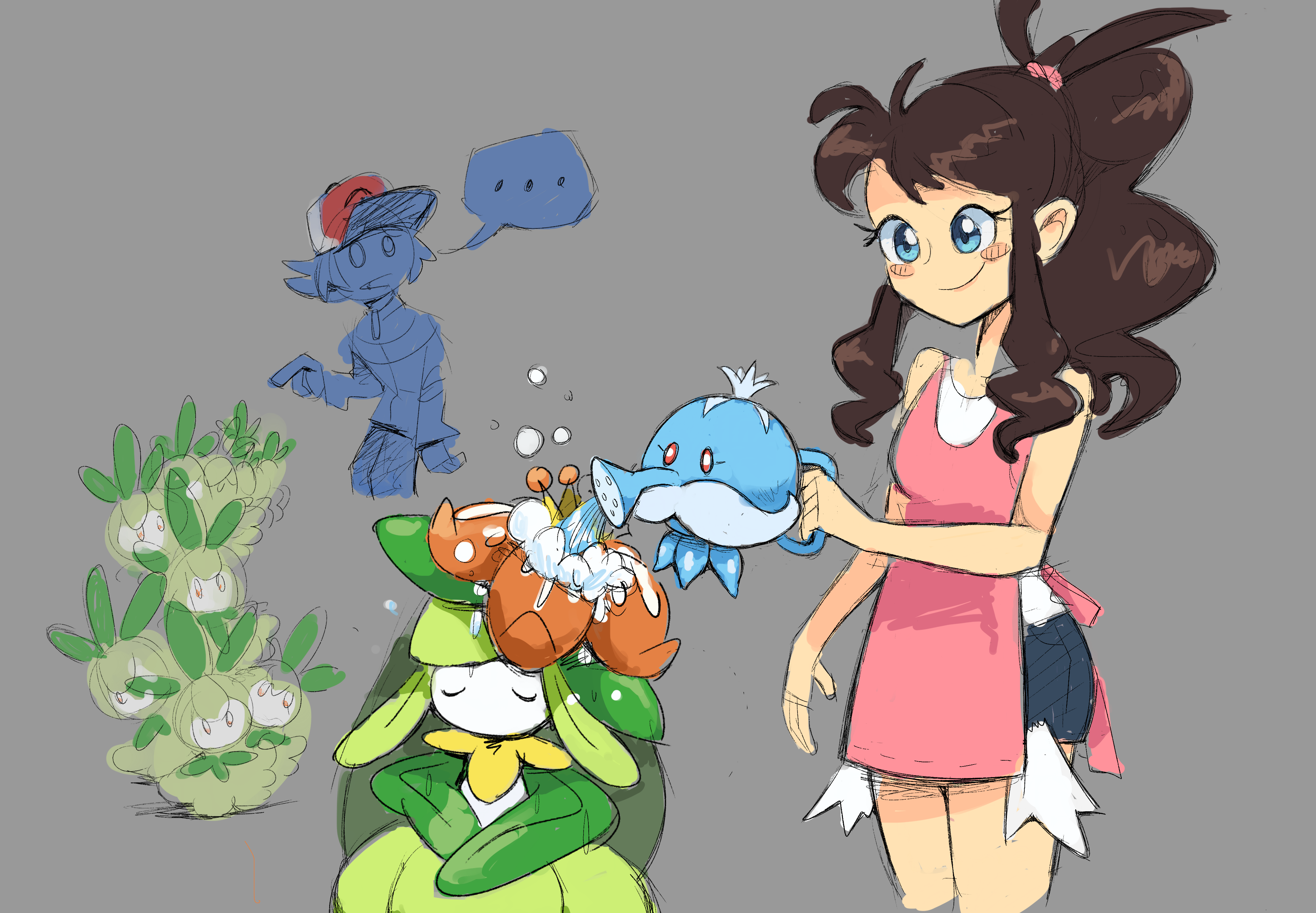 ... 1boy 1girl absurdres apron baseball_cap blue_eyes blush_stickers closed_eyes denim denim_shorts drawfag flower gen_5_pokemon grey_background hat highres hilbert_(pokemon) hilda_(pokemon) jellicent lilligant nintendo petilil pokemon pokemon_(creature) pokemon_black_and_white ponytail shorts smile standing too_many water watering_can
