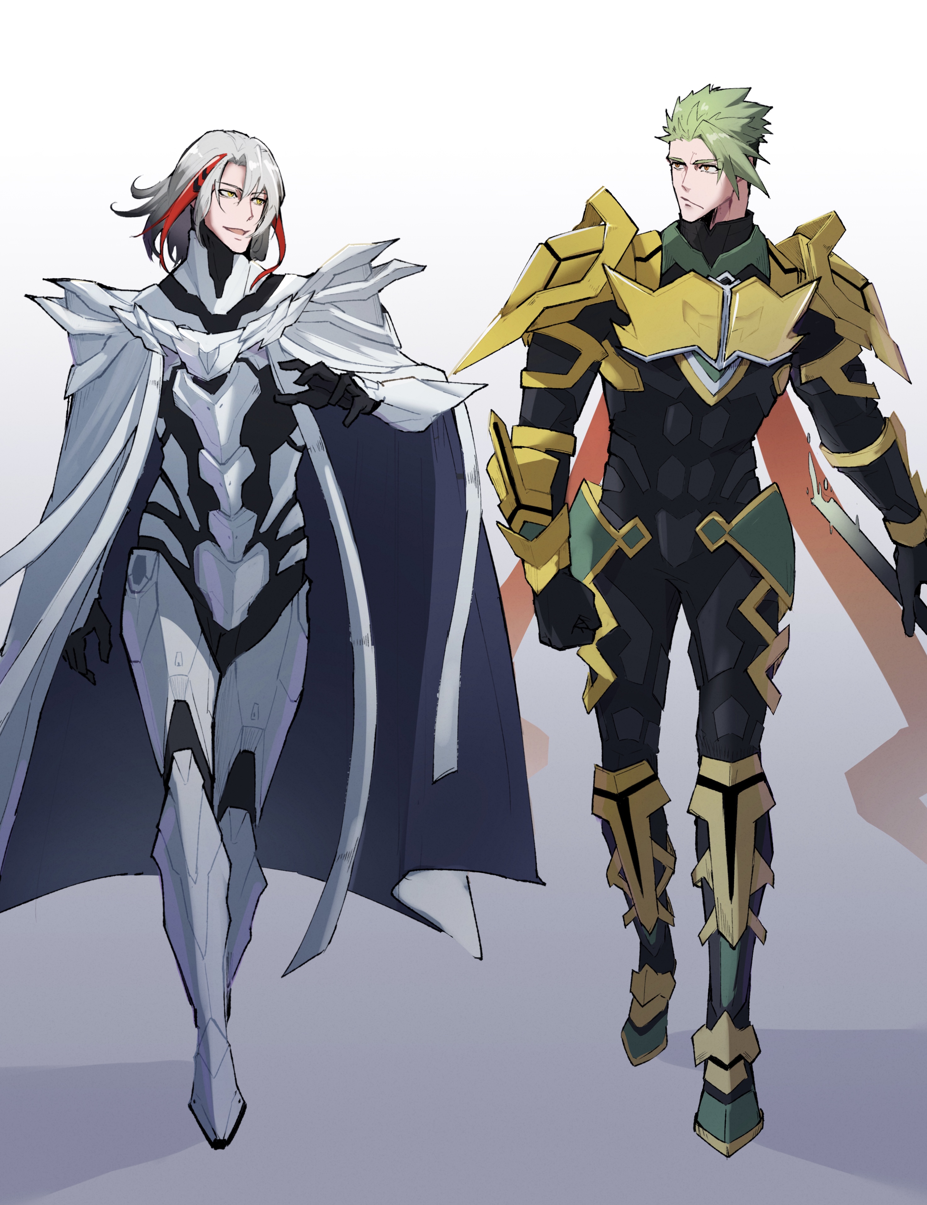 2boys absurdres achilles_(fate) achilles_(third_ascension)_(fate) armor cape fate/grand_order fate_(series) full_body green_hair haruakira highres male_focus multiple_boys missing_headwear odysseus_(fate) odysseus_(third_ascension)_(fate) simple_background white_hair yellow_eyes