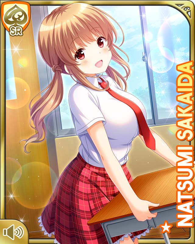 1girl blush breasts brown_hair card_(medium) character_name classroom cowboy_shot day desk female_focus from_side girlfriend_(kari) hair_ornament holding indoors large_breasts long_hair looking_at_viewer necktie official_art open_mouth pink_scrunchie plaid_clothes plaid_skirt qp:flapper red_eyes red_necktie red_skirt sakaida_natsumi school school_desk school_uniform scrunchie shirt shirt_tucked_in short_sleeves skirt smile solo sparkle standing sunlight white_shirt window wooden_floor