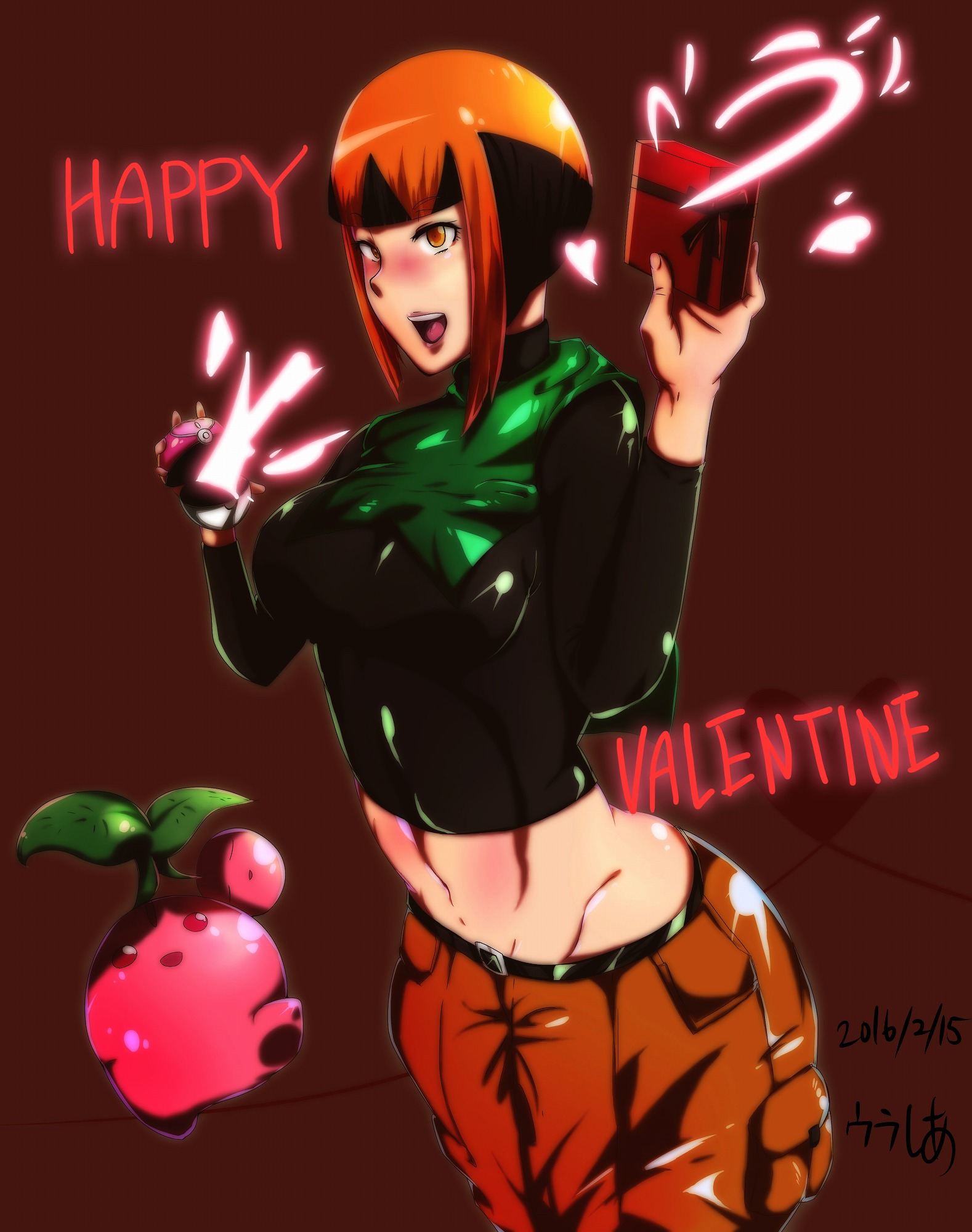 1girl 2016 blonde_hair blush box breasts cherrim dated gardenia_(pokemon) gen_4_pokemon gift gift_box happy_valentine heart highres looking_at_viewer love_ball navel nintendo open_mouth poke_ball pokemon pokemon_diamond/pearl/platinum shiny_clothes shiny_skin short_hair shorts simple_background smile uranosaxia valentine wide_hips