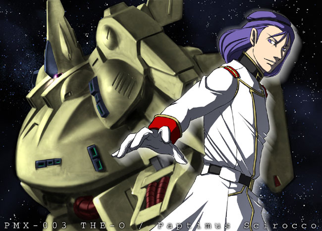 1boy character_name gloves gundam kashiwa_(kishiro) mecha military military_uniform paptimus_scirocco purple_hair robot the_o_(mobile_suit) zeta_gundam