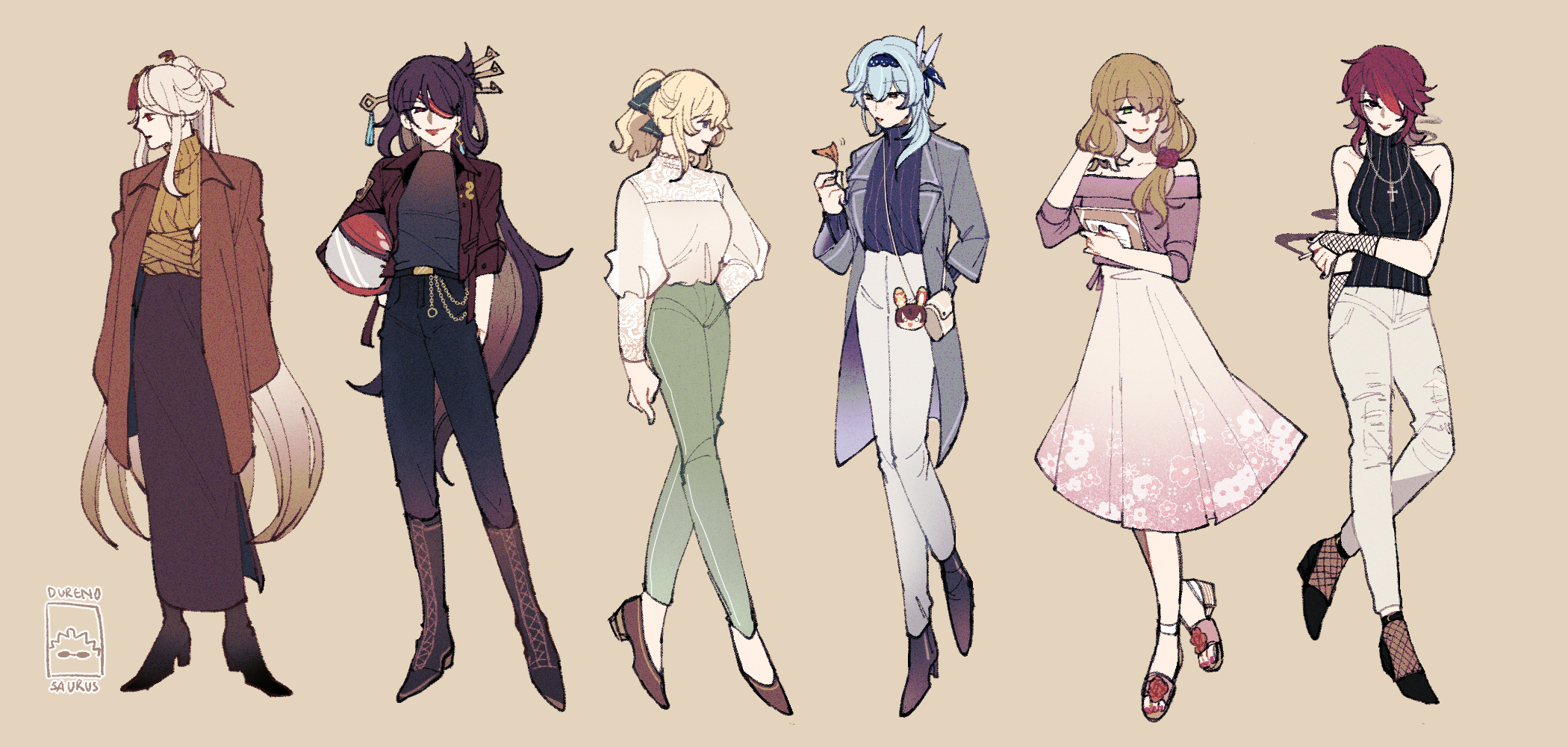 6+girls adjusting_hair alternate_costume aqua_coat arm_at_side armpit_crease arms_at_sides asymmetrical_bangs asymmetrical_hair bare_shoulders baron_bunny_(genshin_impact) beidou_(genshin_impact) belt black_eyes black_footwear black_gloves black_hair black_jacket black_pants black_shirt blonde_hair blouse blue_eyes blue_hair blue_shirt book boots bow-shaped_hair breasts brown_coat brown_footwear chain character_request cigarette closed_mouth coat coat_on_shoulders collarbone collared_coat collared_jacket commentary_request contemporary cropped_jacket cross cross-laced_footwear cross_necklace crossed_arms crossed_legs denim durenosaurus earrings eula_(genshin_impact) eyepatch facing_viewer fashion fishnet_footwear fishnet_gloves fishnets flats flower foot_up footwear_flower footwear_request full_body genshin_impact gloves gradient_clothes gradient_hair gradient_skirt green_background green_hair green_pants green_sweater grey_shirt hair_between_eyes hair_flower hair_ornament hair_over_one_eye hair_over_shoulder hair_stick halterneck hand_on_own_hip hand_up headband helmet high_ponytail highres holding holding_book holding_cigarette holding_leaf holding_unworn_helmet jacket jean_(genshin_impact) jeans jewelry lace lace-trimmed_shirt lace_trim large_breasts latin_cross leaf light_blue_hair lips lisa_(genshin_impact) long_hair long_skirt long_sleeves looking_to_the_side medium_breasts medium_hair medium_skirt motorcycle_helmet multicolored_hair multiple_girls necklace ningguang_(genshin_impact) off-shoulder_shirt off_shoulder open_clothes open_coat orange_hair pants pastel_colors pencil_skirt pink_skirt pleated_skirt ponytail profile puffy_long_sleeves puffy_sleeves purple_shirt purple_skirt red_eyes red_flower red_hair rosaria_(genshin_impact) rose shirt sidelocks simple_background single_earring skirt sleeve_cuffs sleeveless sleeveless_shirt sleeves_past_wrists smoke standing sweater tassel tassel_hair_ornament torn_clothes torn_legwear turtleneck turtleneck_sweater unworn_helmet very_long_hair watson_cross white_hair white_pants white_skirt