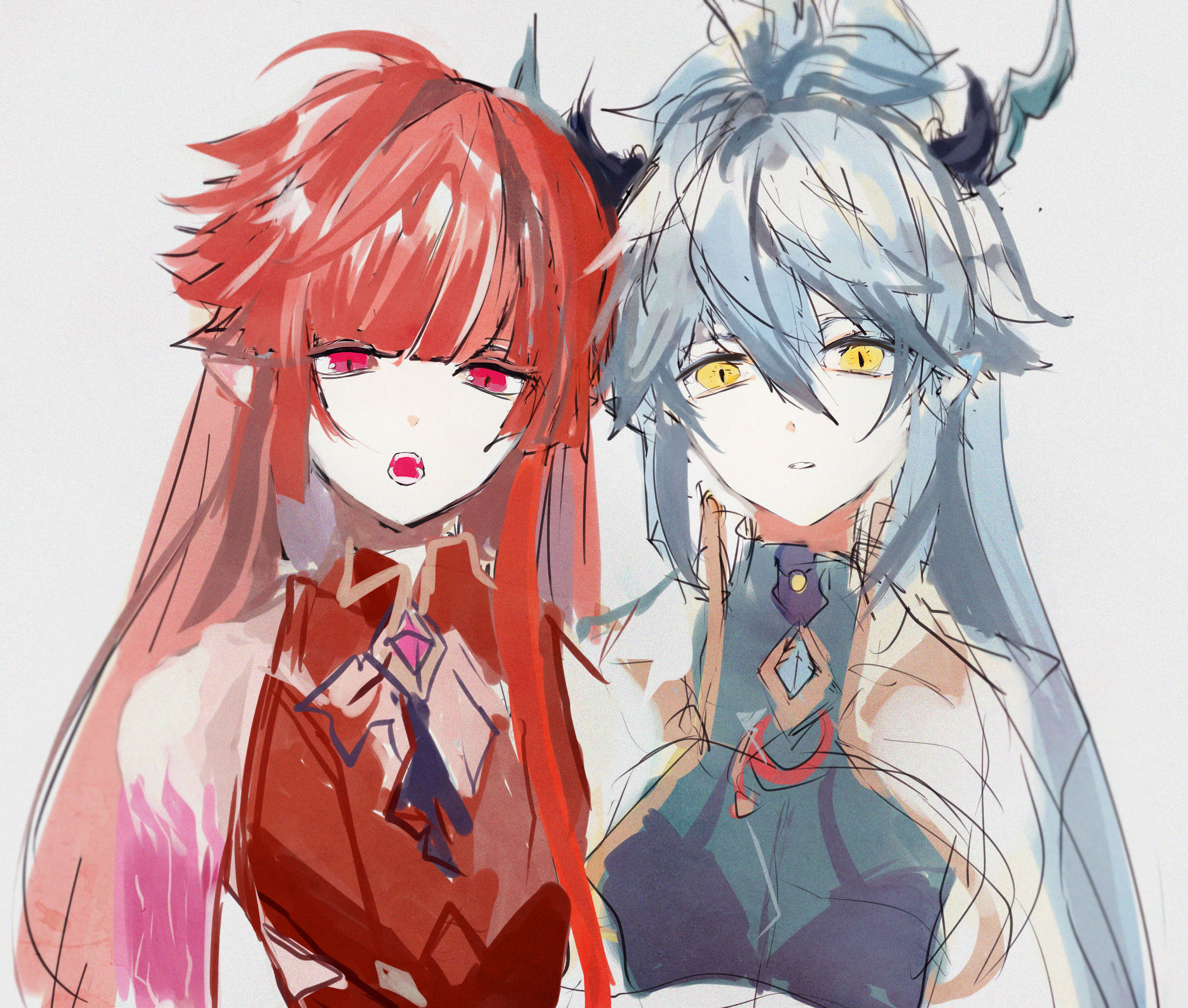 2boys androgynous blue_hair denif_(elsword) dragon_boy dragon_horns elsword highres horns kurayuki0404 long_hair looking_at_viewer male_focus multiple_boys open_mouth parted_lips pointy_ears ponytail red_eyes red_hair rosso_(elsword) sketch teeth trap very_long_hair white_background yellow_eyes