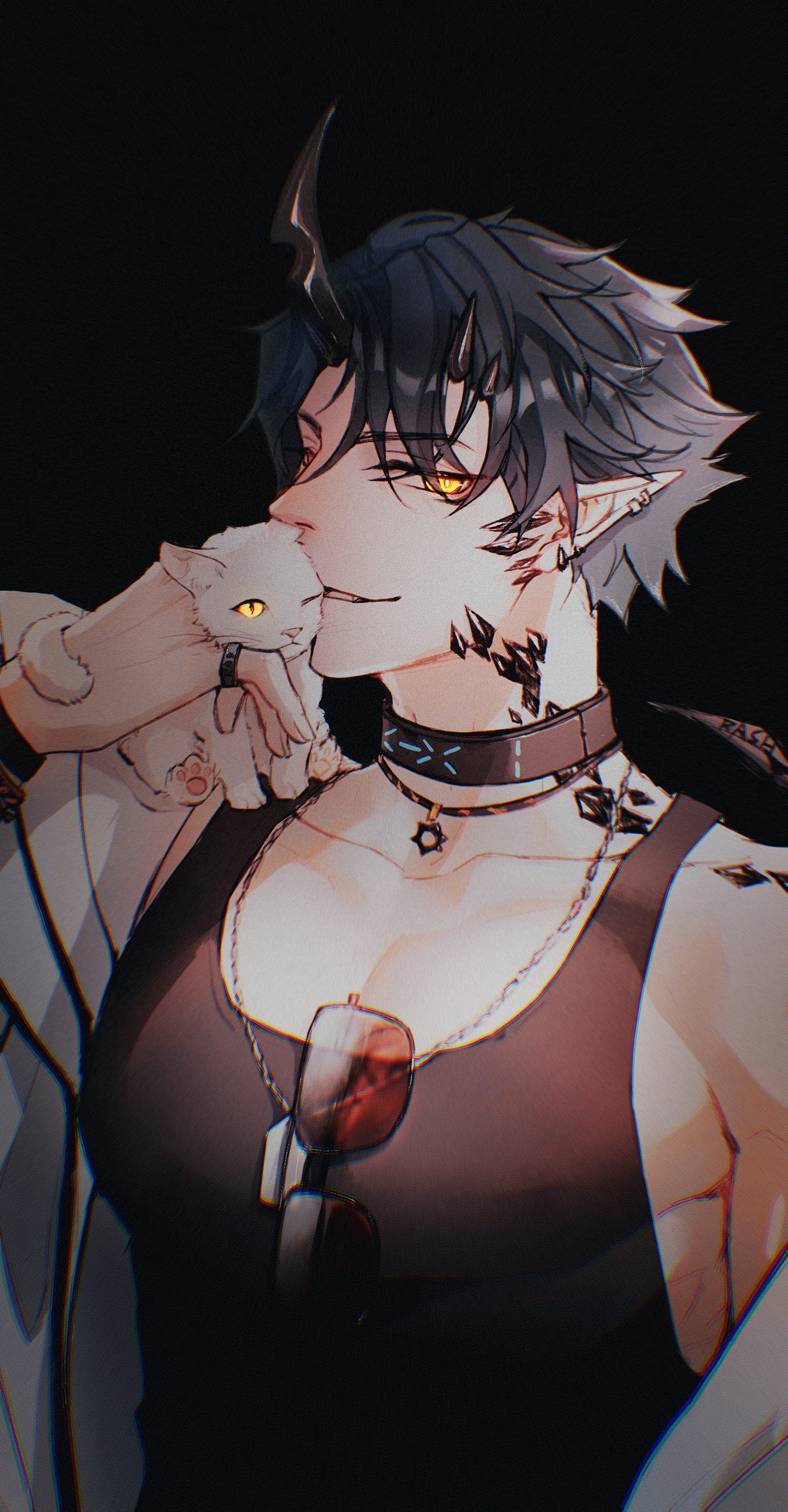 1923rash 1boy absurdres arknights bishounen black_background black_hair black_shirt cat eyebrows_hidden_by_hair eyewear_hang flamebringer_(arknights) flamebringer_(casual_vacation)_(arknights) highres horns infection_monitor_(arknights) jewelry kiss male_focus material_growth necklace orange_eyes oripathy_lesion_(arknights) pointy_ears ring shirt simple_background solo sunglasses tank_top toned toned_male unworn_eyewear upper_body white_cat